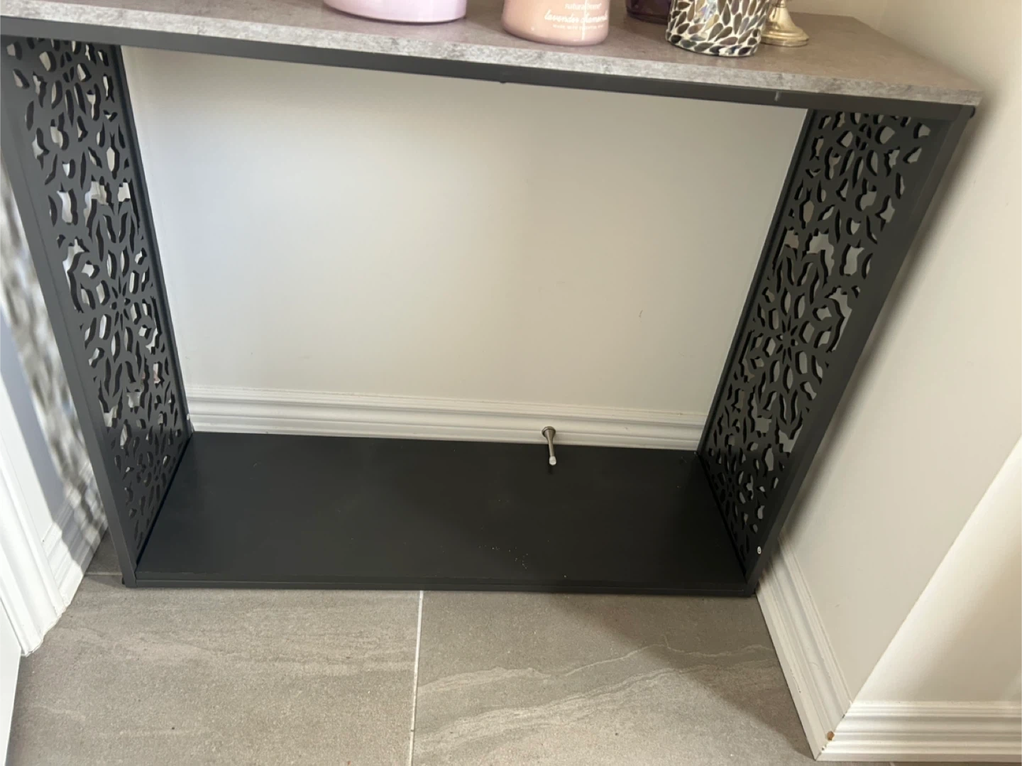 16Selling a stylish console table, perfect for adding a touch of elegance to your entryway or living room! It features decorative cutouts on the sides and a sleek grey finish. Would look great with some plants or decorative items on top!