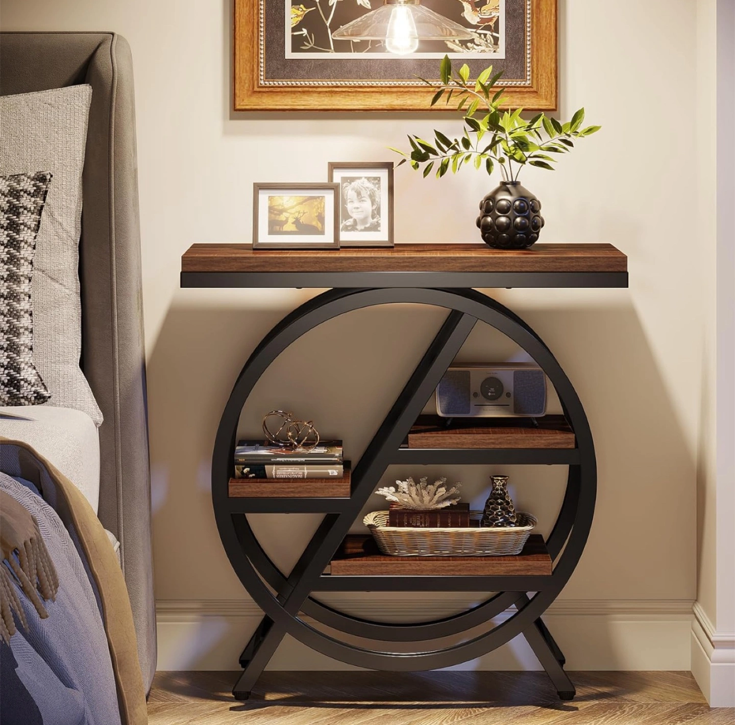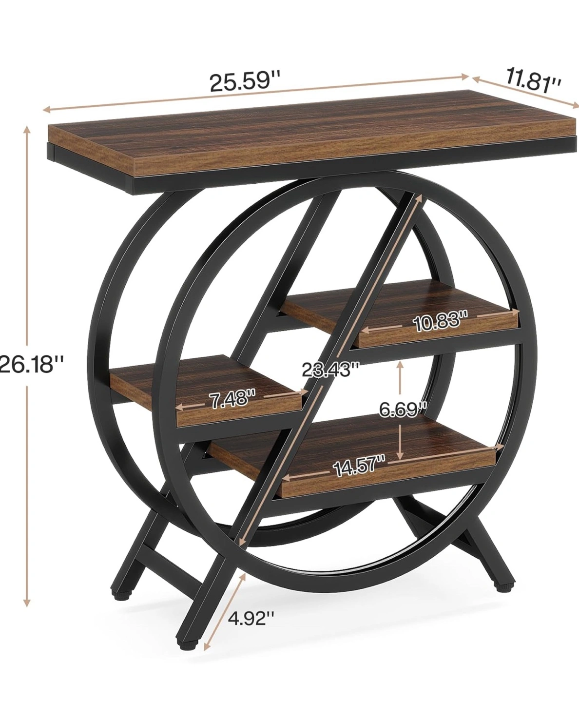 223New open box 3-Tier End Table with Storage】 With 3 open shelves, this slim side table provides a cozy spot for various items, from your favorite books and indoor plants to desk lamps and other personal adornments. Say goodbye to the chaos, this sofa end table ensures that your living room or bedroom is organized and clutter-free. 【Multifunctional Sofa Side Table】 Displays 2 tables nestle gracefully into your bedroom, serving as bedside tables. This piece can also be used in the living room as an excellent sofa end table, or in your office as a couch table for displaying chic decor items. You can even place it between the sofas to make it a small coffee table. Give free rein to your good ideas! 【Timeless Industrial Chic】 The warm allure of the wood harmoniously plays off the stark elegance of the cold metal frame. The rectangular wooden top in rich rustic brown offers depth to your decor, while the geometric frame introduces a chic elegance. This small side table will be a fine testament to your refined taste, effortlessly adding character to your home decor. 【Stable and Durable】 The rustic side table is robustly constructed with 0.59" E1 high-grade particle board shelves and a heavy-duty metal frame, able to support up to 30 lb. The retro veneer is water-resistant, scratch-resistant, and super easy to clean. 4 adjustable foot pads of this living room end table keep it more stable even on uneven floors and prevent scratches.