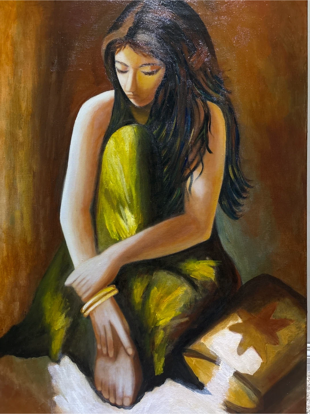 10A captivating hand-painted artwork portraying a woman in deep reflection. The rich tones of amber, olive, and gold create warmth and emotion, making this piece a striking addition to any space. Painted on stretched canvas with fine detail and texture, it blends modern and classic styles beautifully. I received it from a friend but I’m not a fan of art. Condition: Good Size: 89 × 60 cm (35 × 24 in) Price: $120 (negotiable)
