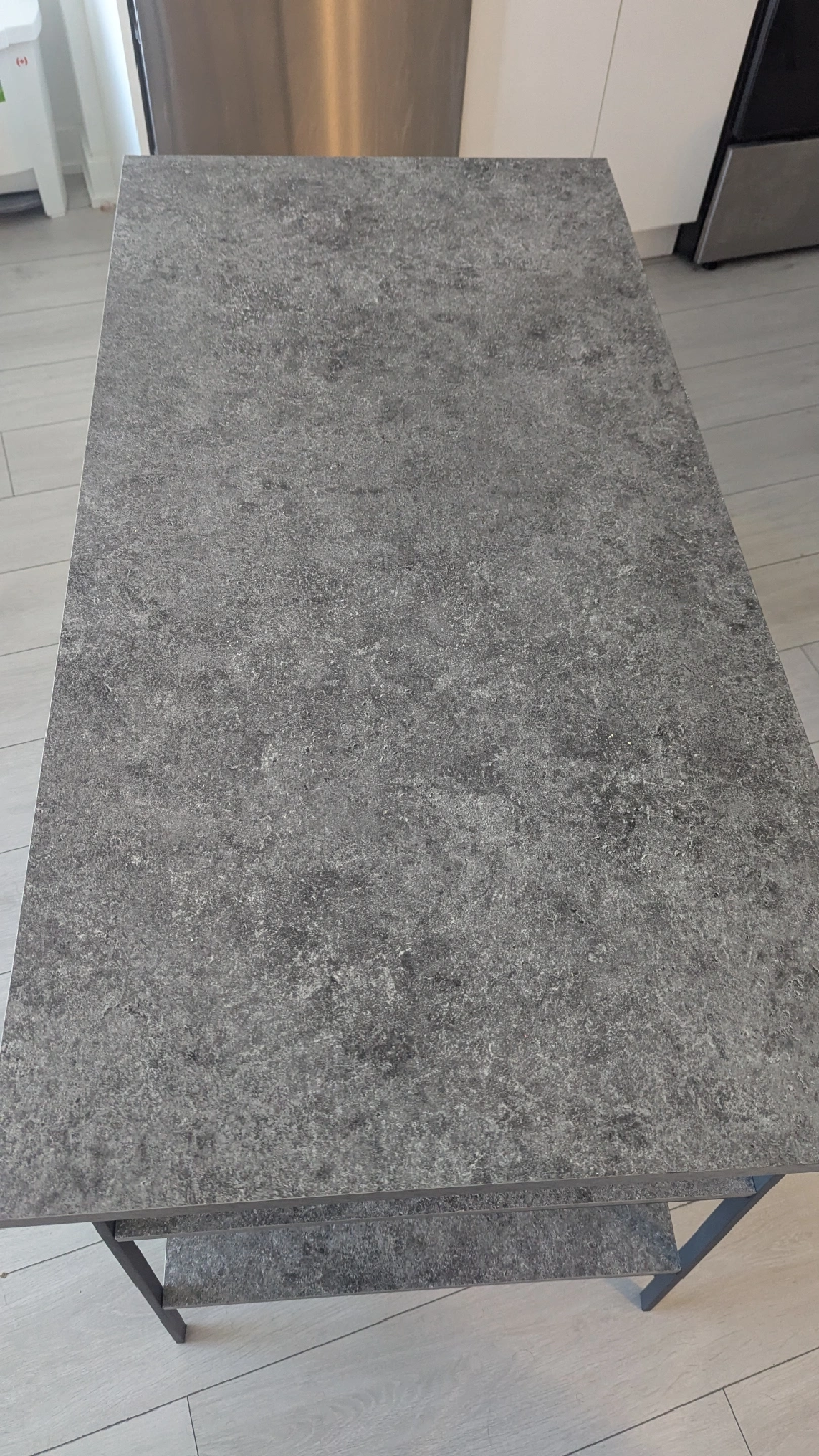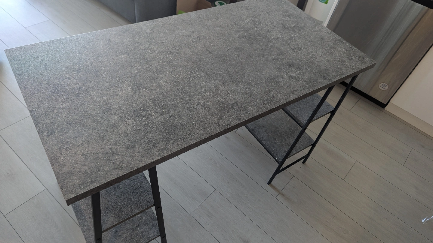 Looking to sell this brand new desk! It features a sleek grey top and black metal legs, complete with convenient shelves on each side. It's perfect for a home office or study space and adds a modern touch to any room