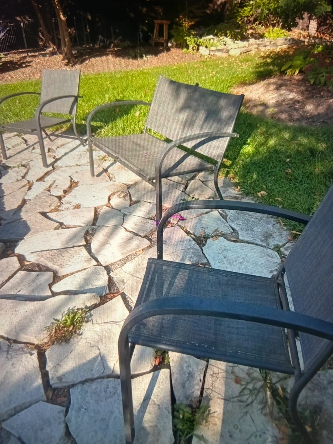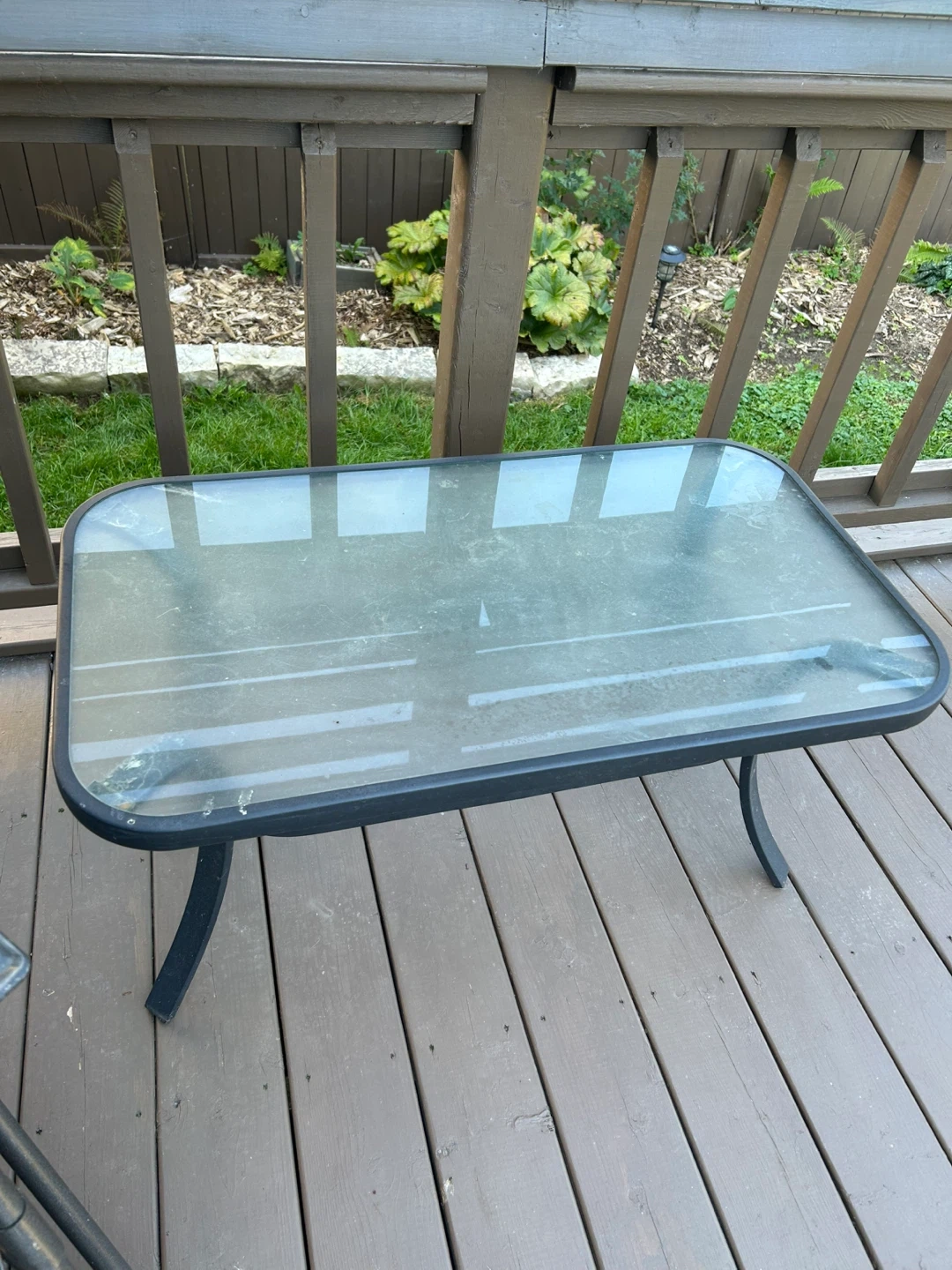 Outdoor glass top coffee table with a black metal frame. Two chairs and love seat.Perfect for your patio or deck to enjoy a cup of coffee or a book. It's in good condition and ready for a new home! Cash and carry Keswick