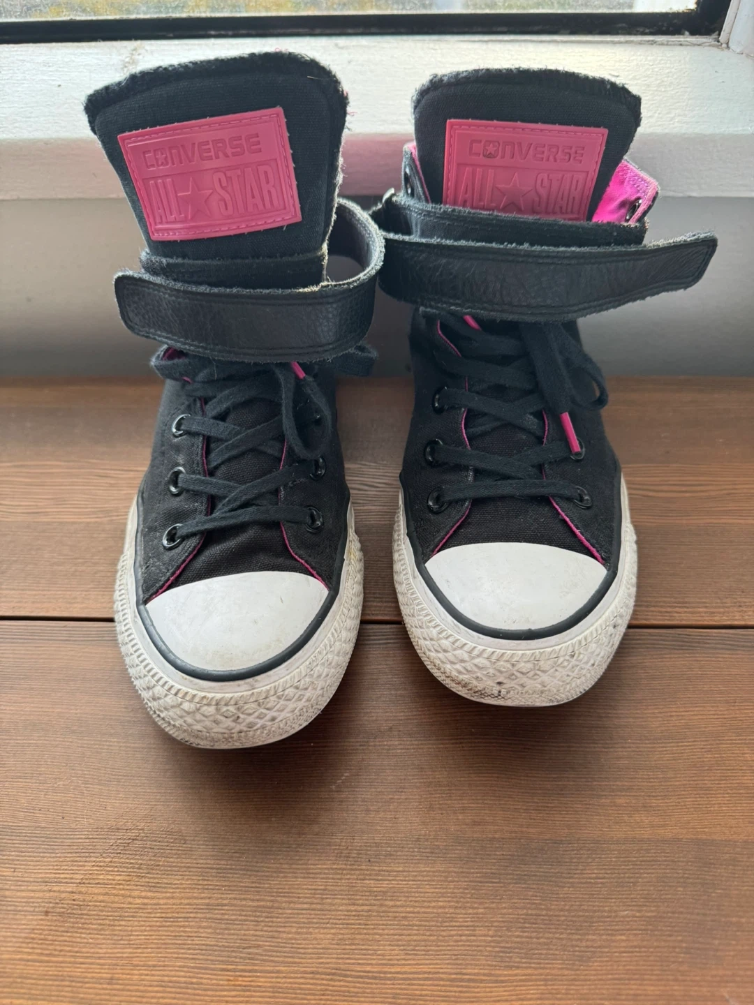 26Selling a pair of Converse All Star high top sneakers in black with pink accents! They're in good condition and ready for a new home. Size 8 US 24.5cm