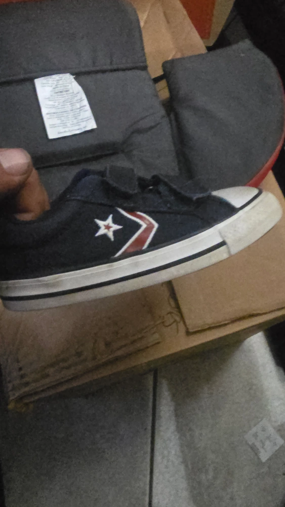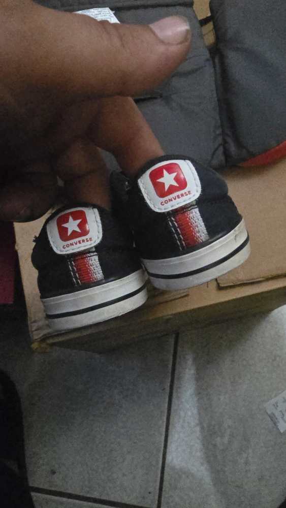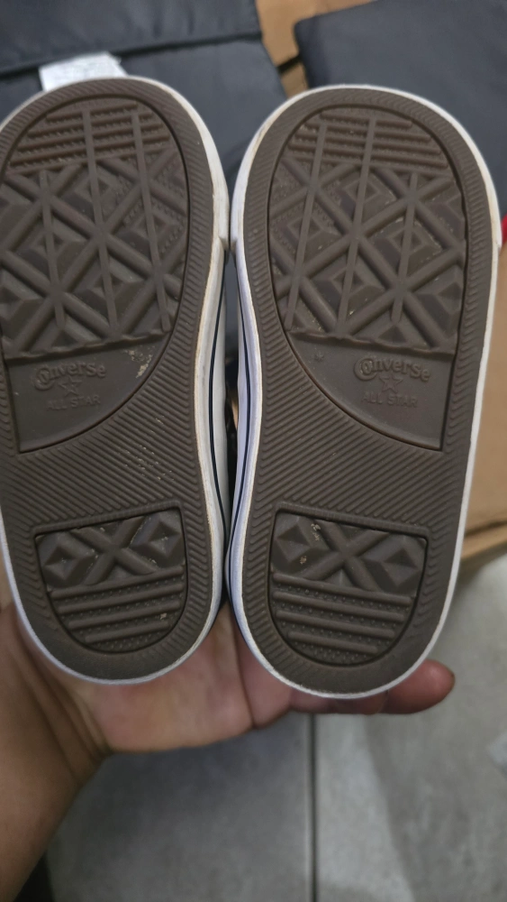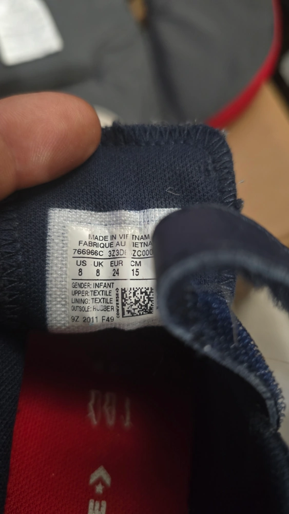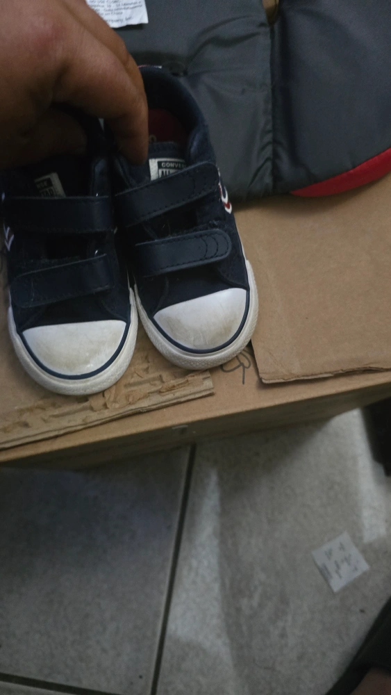 60These are a pair of Converse All Star infant sneakers in a size 8 US. They are navy blue with the classic Converse logo and a velcro strap. They show some signs of wear but are still in good condition for a little one to run around in!
