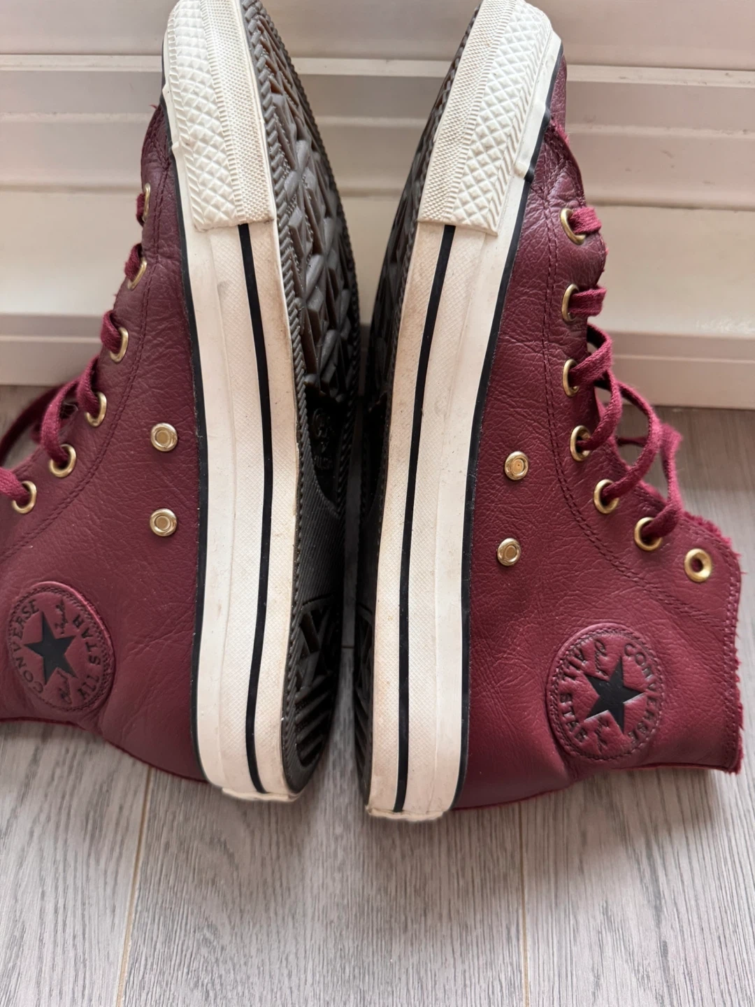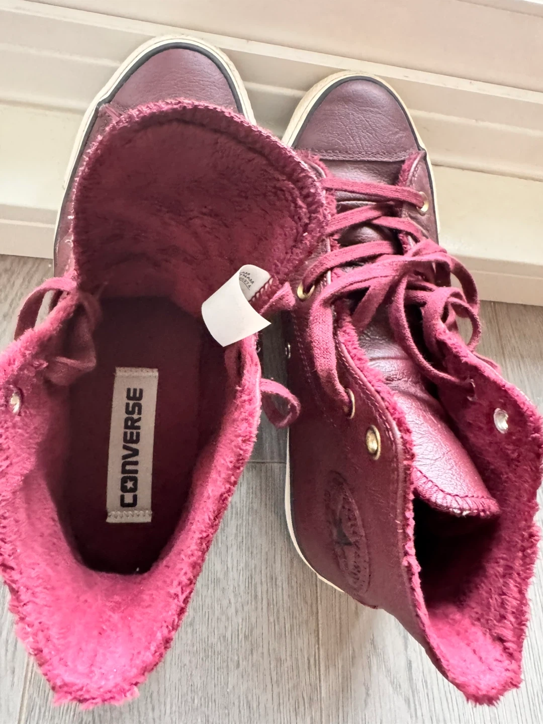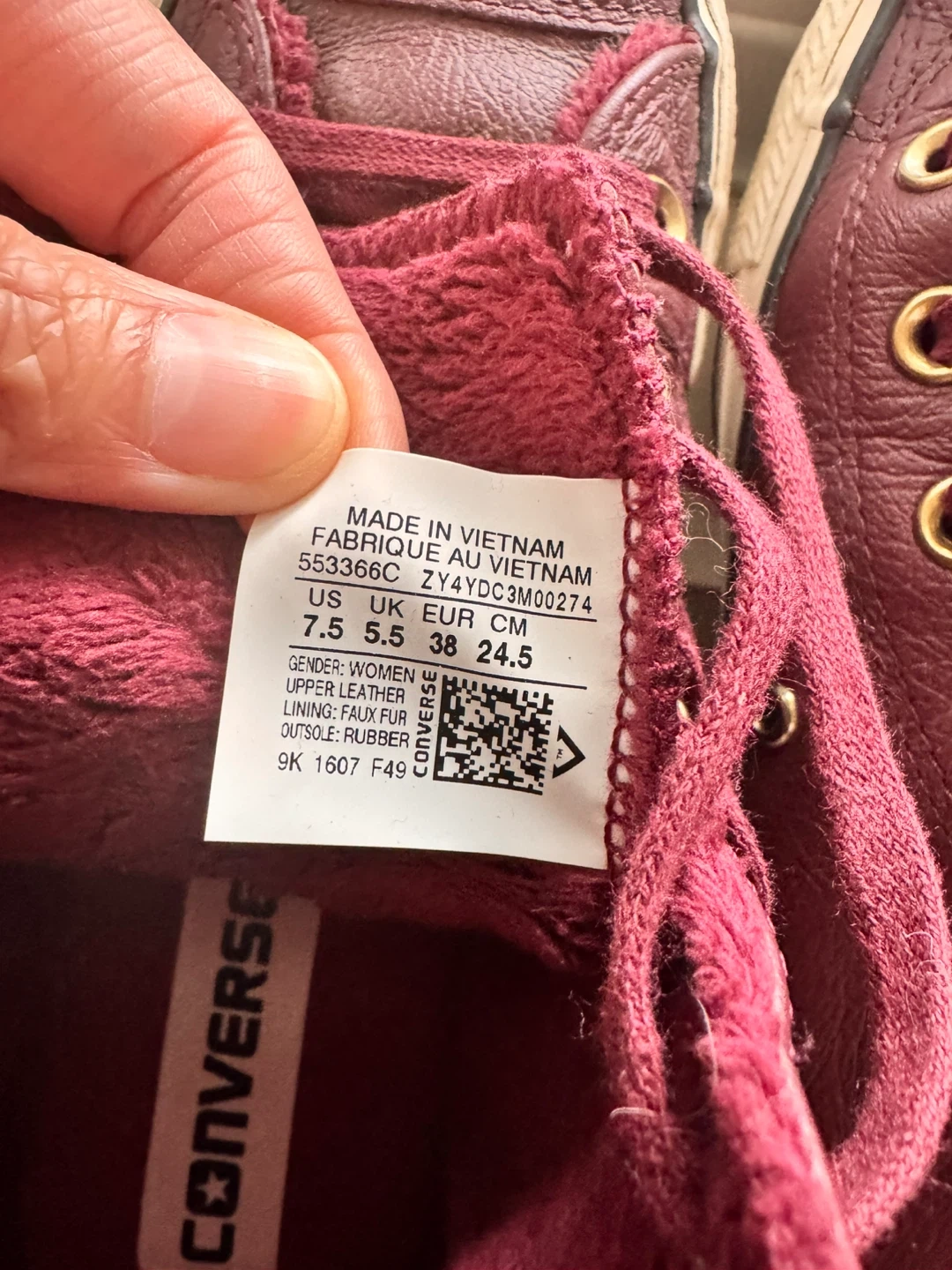 65Selling a pair of Converse All Star high tops in a lovely burgundy leather! They are a women's size US 7.5, UK 5.5, EUR 38, 24.5 CM. They have a faux fur lining, and a rubber outsole. These are perfect for adding a bit of edge to your look!