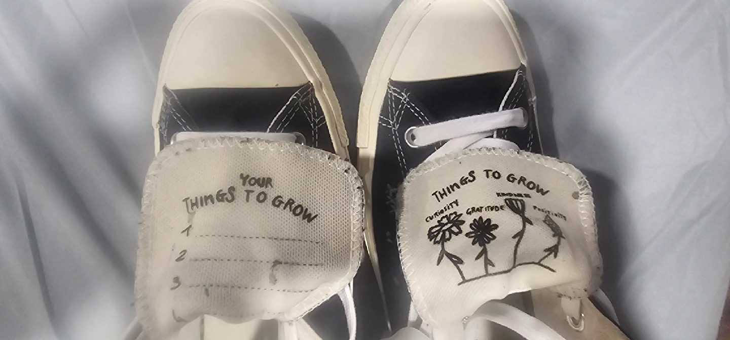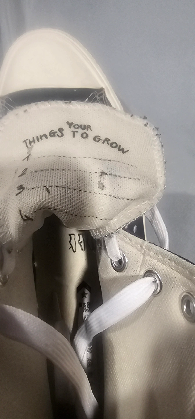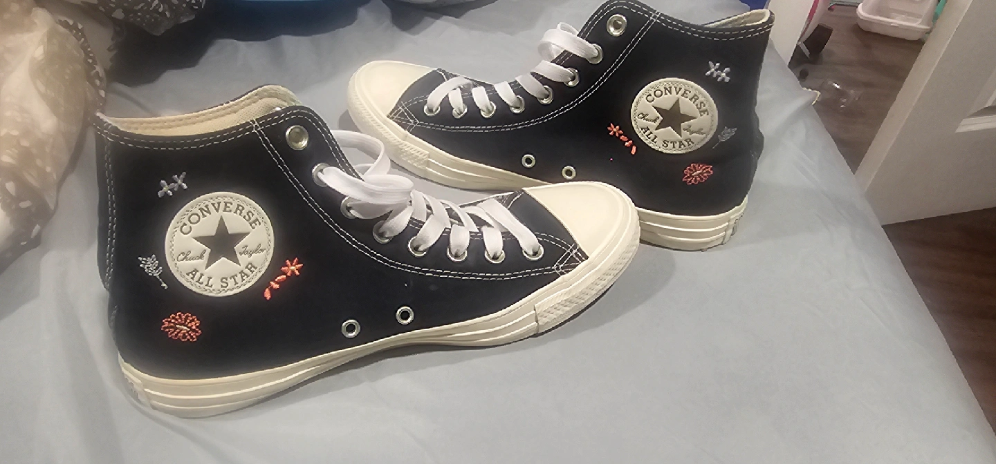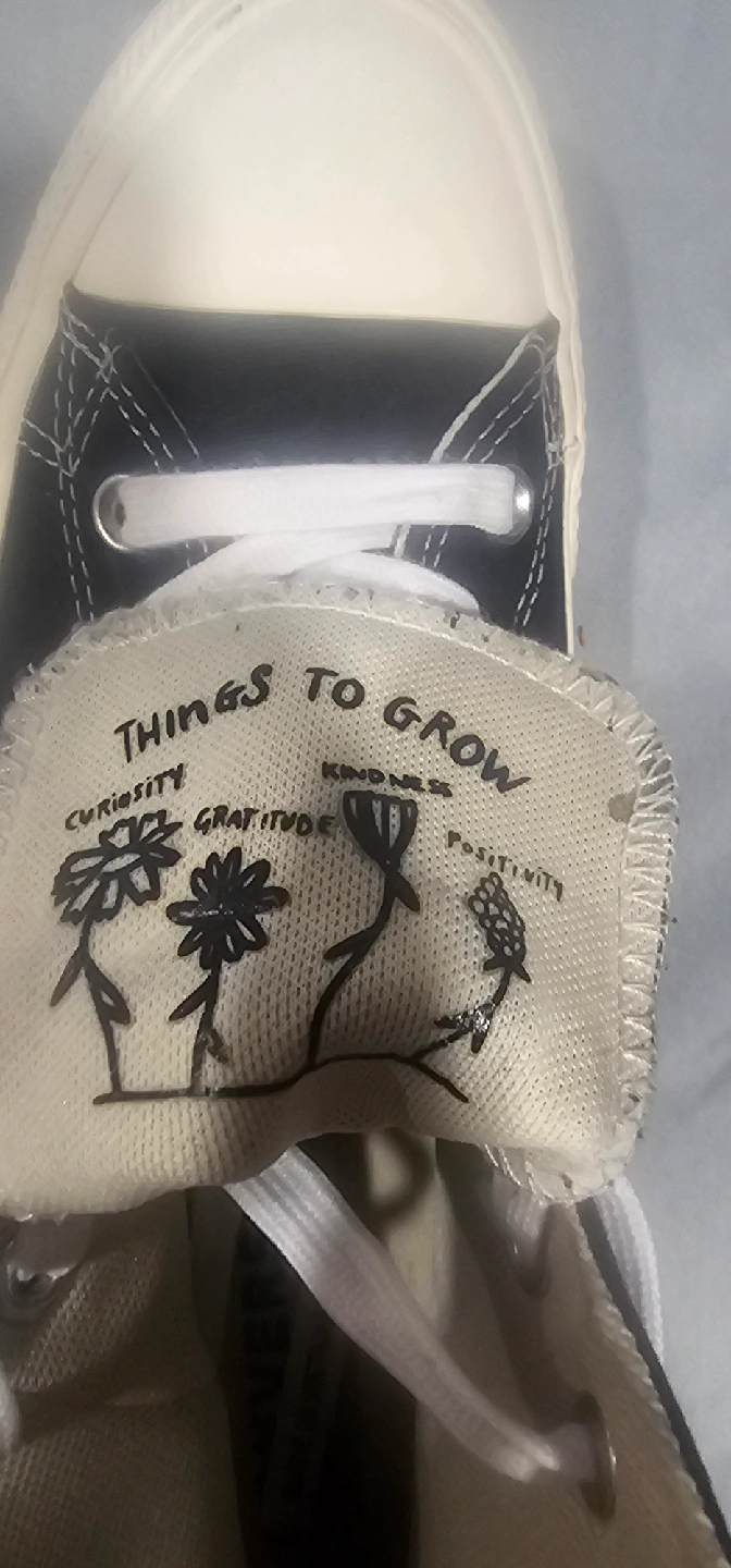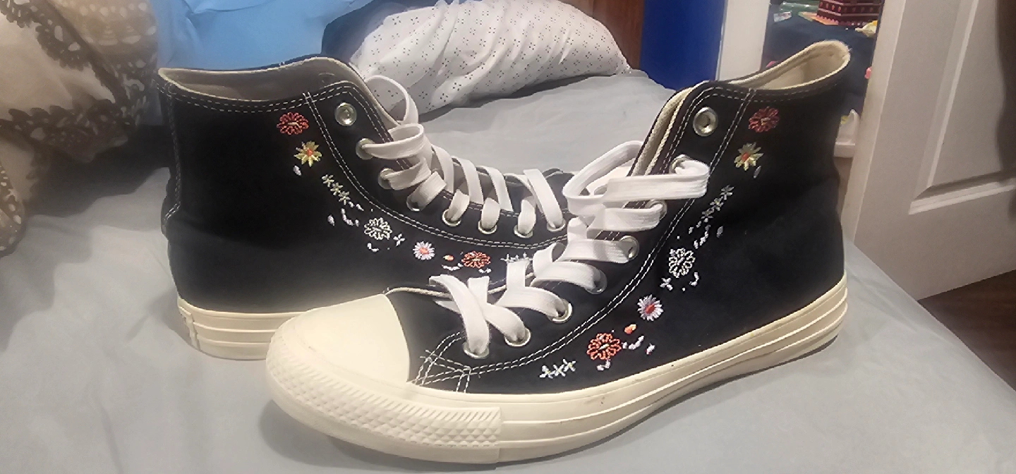 These are a pair of Converse All Star high top sneakers! They feature a black canvas upper with a white rubber sole and toe cap. There's some cute floral embroidery on the sides. The tongue has a unique design with the words "Things to Grow" and little drawings. They're in great condition and ready for a new home!