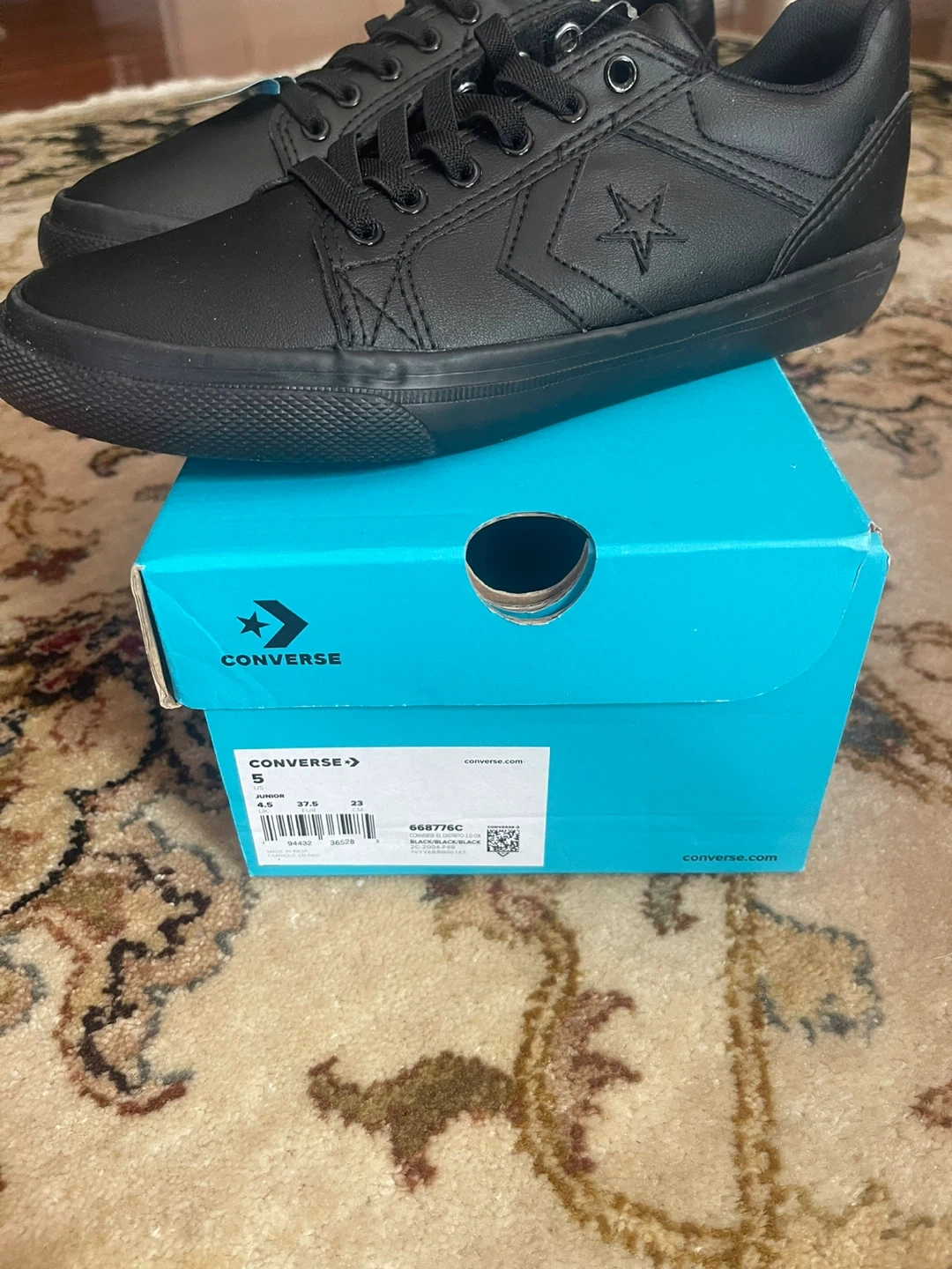 Selling a pair of Converse Junior sneakers in black. They are a youth size 5 (US). The box is included!