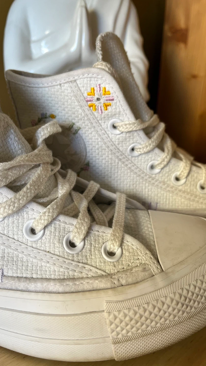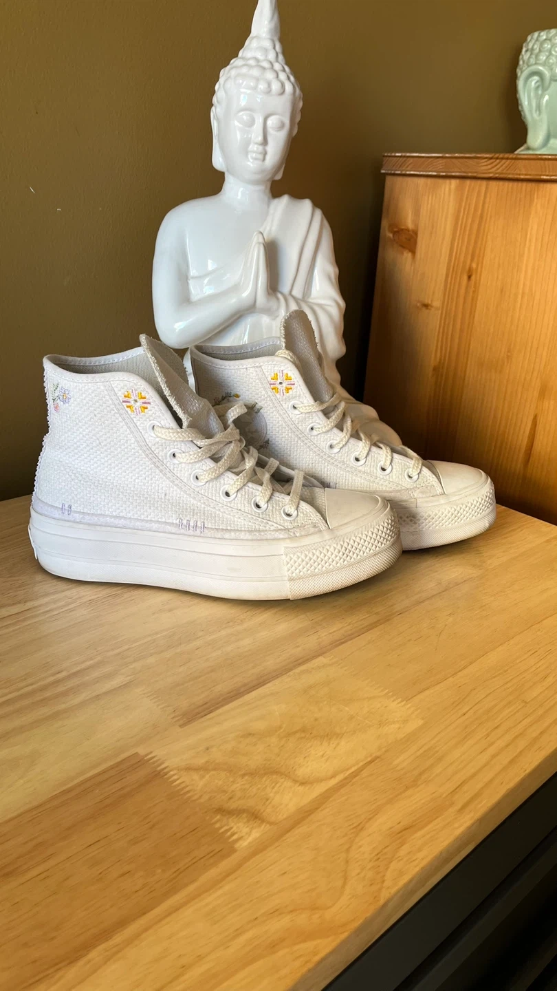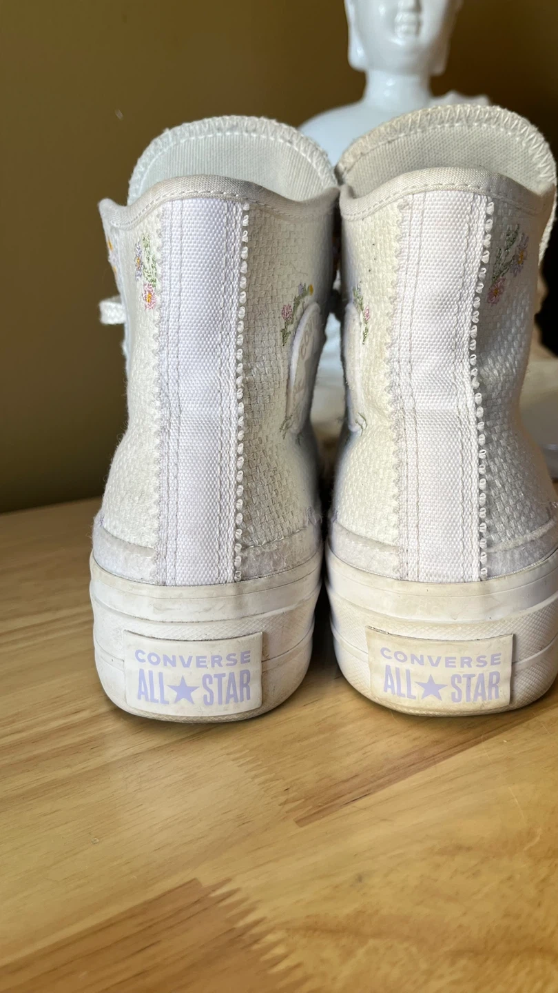 520Selling a pair of Converse Lift platform high top sneakers! They feature a beautiful embroidered design and are in good condition. These shoes are a stylish addition to any outfit!