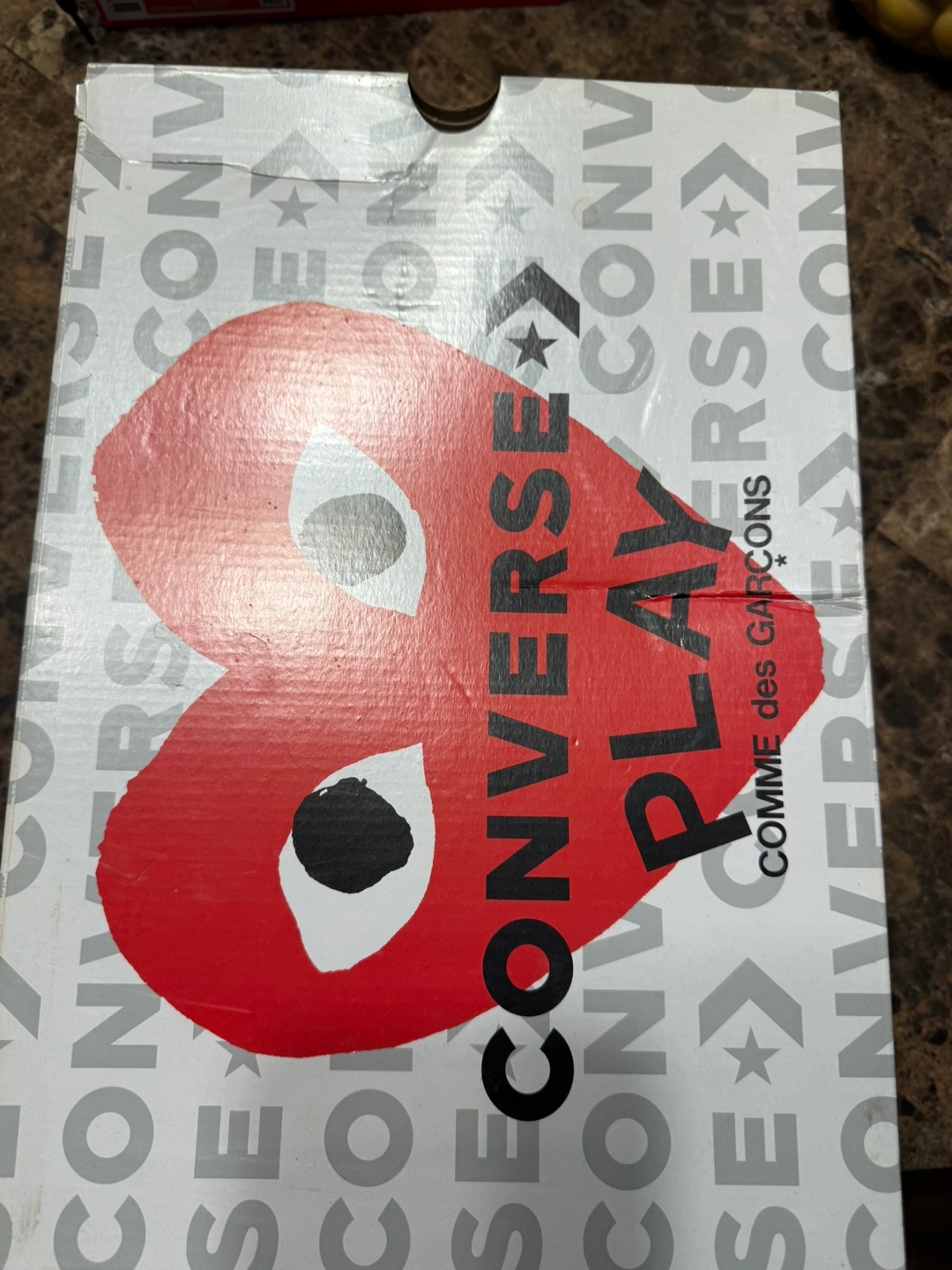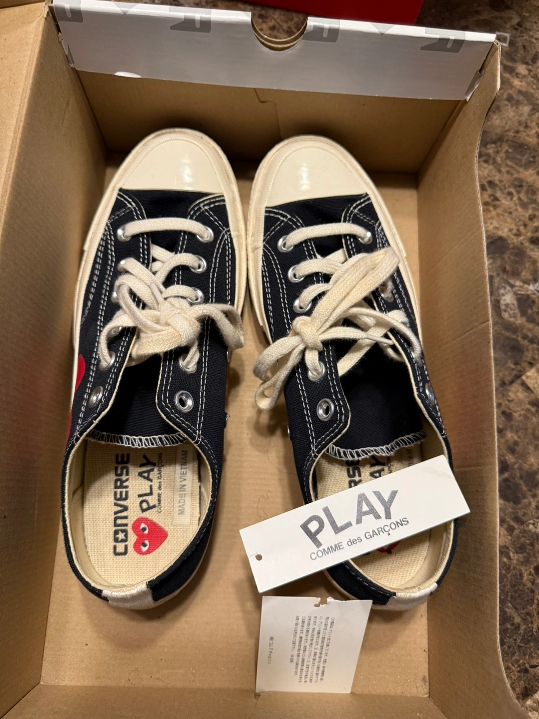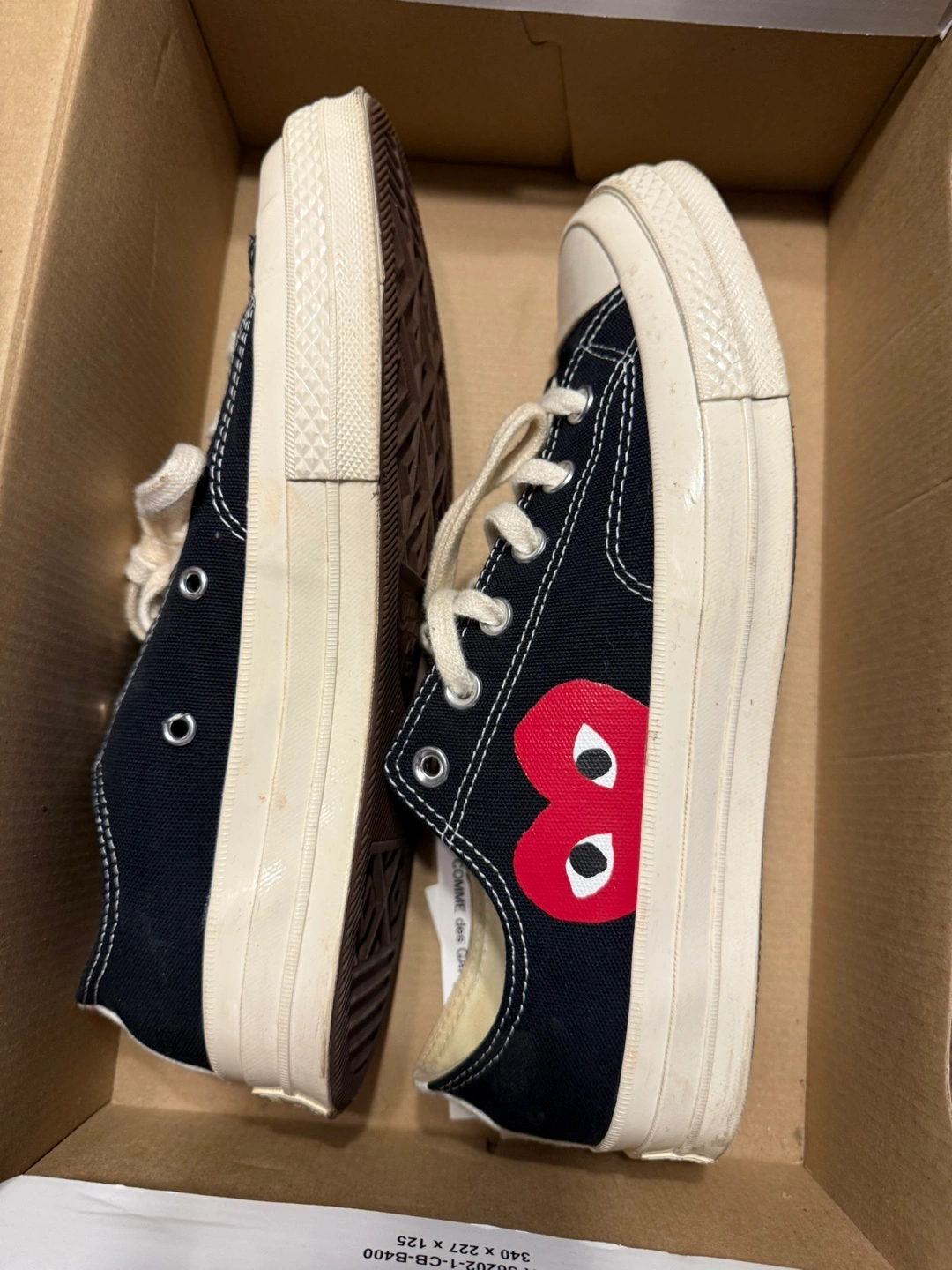 Selling a pair of Converse PLAY Comme des Garçons sneakers in size 8. These stylish sneakers feature the iconic heart and eyes logo. They come in the original box!
