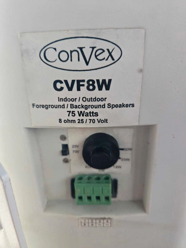 not tested sold as is looking for quick sale For sale, a pair of Convex CVF8W indoor/outdoor foreground/background speakers, delivering 75 Watts at 8 ohms and also compatible with 25/70 Volt systems. These speakers have served me well, providing clear and robust sound, but I'm downsizing, so it's time for them to find a new home. Please note these speakers are used, but in good working condition. Specifications: * Model: CVF8W * Type: Indoor/Outdoor Foreground/Background Speakers * Power: 75 Watts * Impedance: 8 ohms * Voltage Compatibility: 25/70 Volt Based on comparable Kijiji listings, a reasonable price for these speakers is $120.00. If the ad is up, the speakers are available.