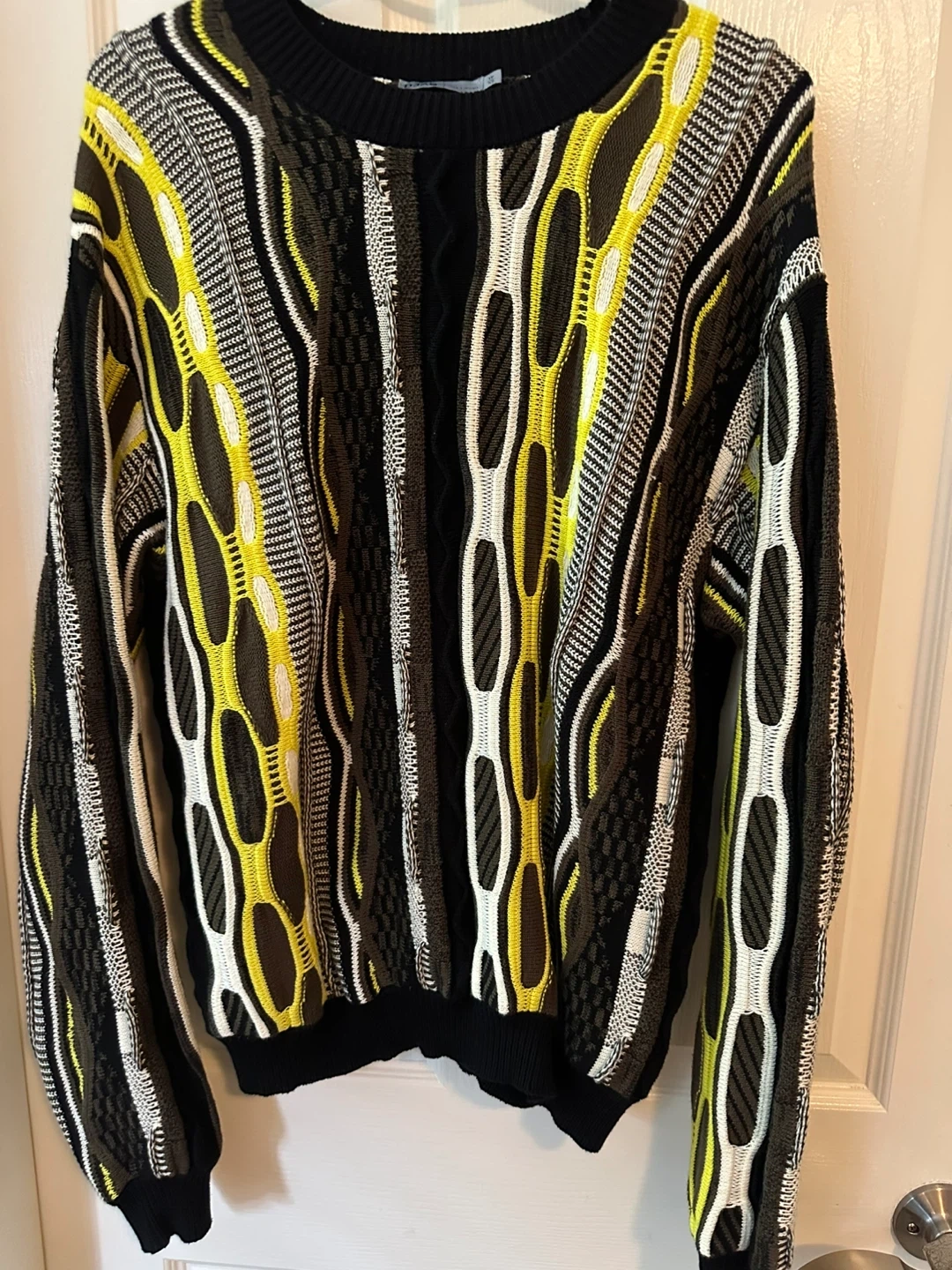 18Selling a Coogi sweater with its signature vibrant and intricate design. It's a real statement piece! The sweater features a mix of colours including yellow, white, brown, and black. Perfect for adding a unique touch to your wardrobe