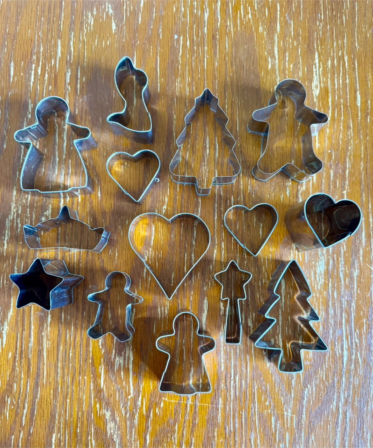 92Selling a set of assorted cookie cutters! They come in various shapes like hearts, stars, gingerbread people, Christmas trees, and more. Perfect for baking some fun treats!