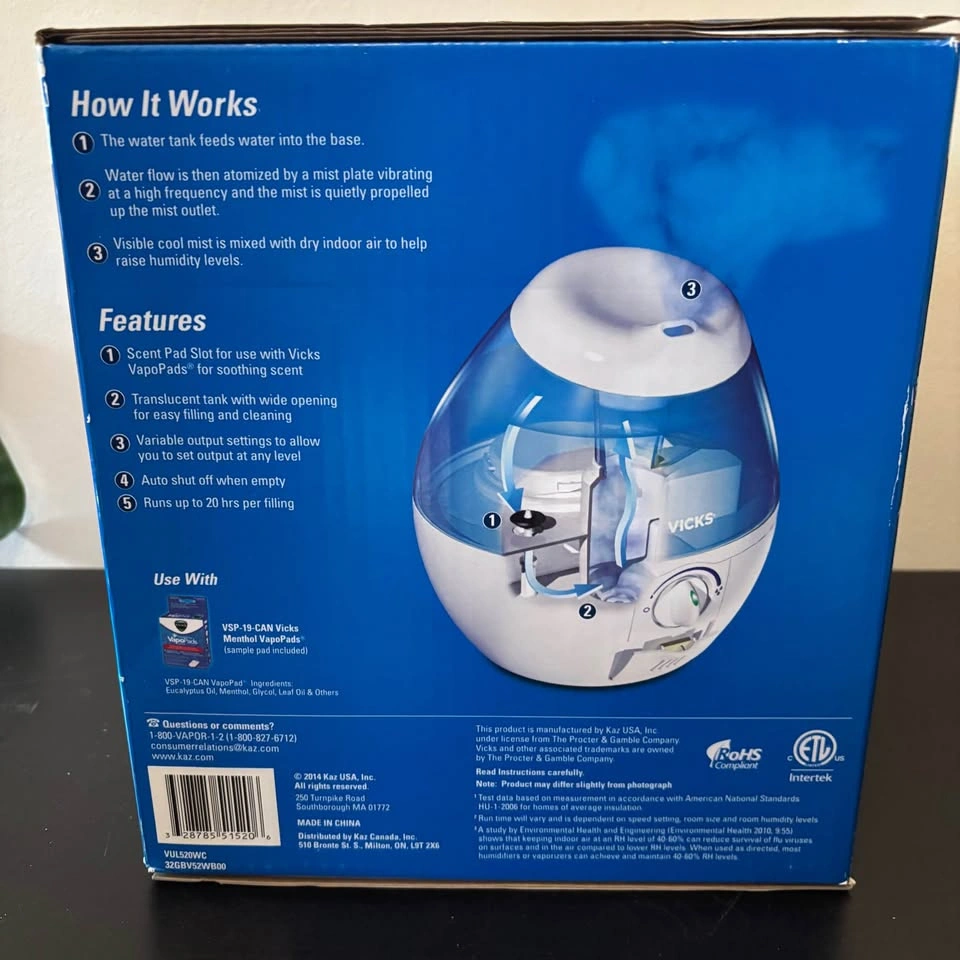 10Vicks brand cool mist humidifier for small rooms. Never used, still in original packaging. Price is firm. Pick up in Millrise (SW).