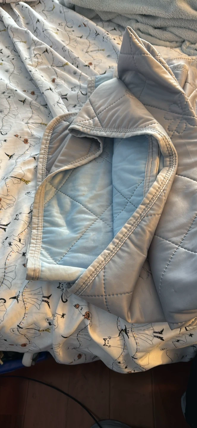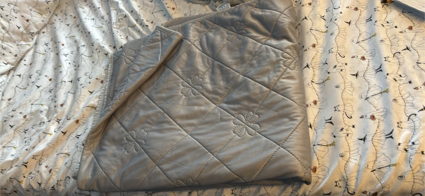 65Selling a gently used cooling quilted blanket. It's a light grey colour with a diamond pattern on one side and a light blue colour on the other. Perfect for adding a cooling touch to any bed!