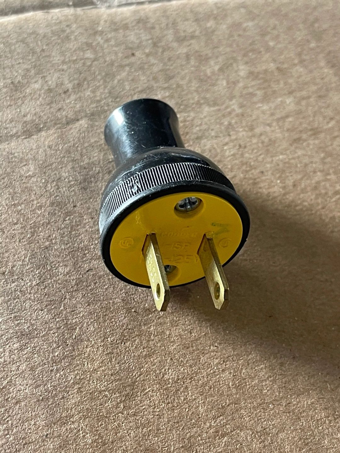 Vintage electrical plug. Two-prong, 15 amp, 125 volt. Yellow and black plastic housing. Great for antique or vintage electrical projects.