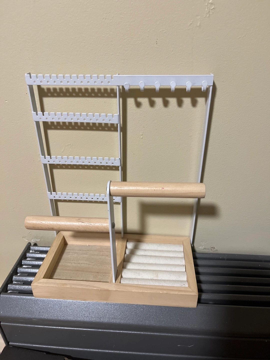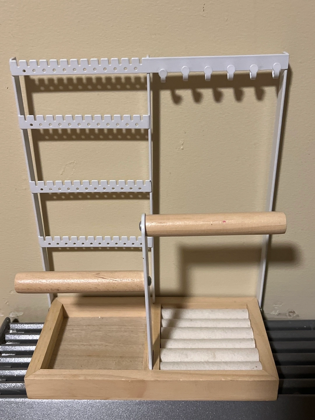 Jewelry organizer stand. White metal frame. Wooden base and bar. Multiple earring slots. Necklace hooks. Ring rolls. Perfect for keeping jewelry organized.