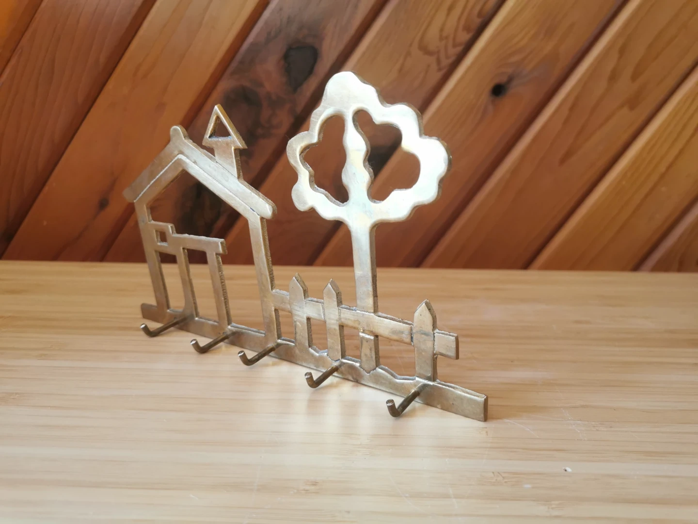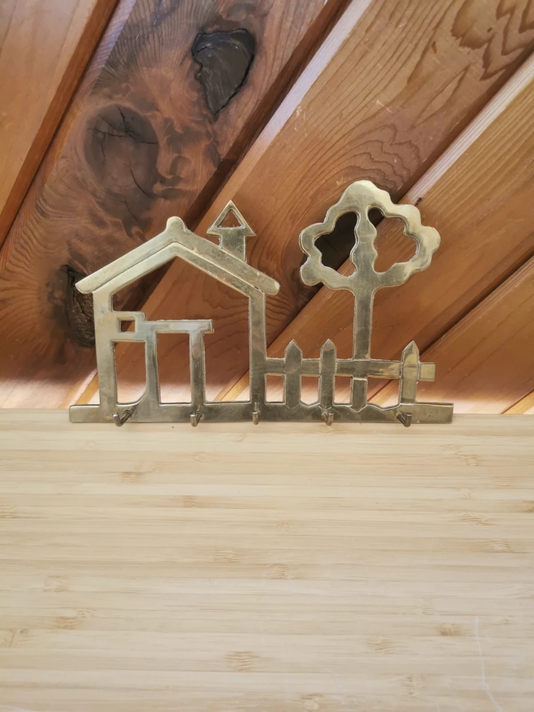 Charming vintage brass key holder featuring a detailed house, tree, and picket fence scene. Beautifully brass decor that adds character and rustic charm.