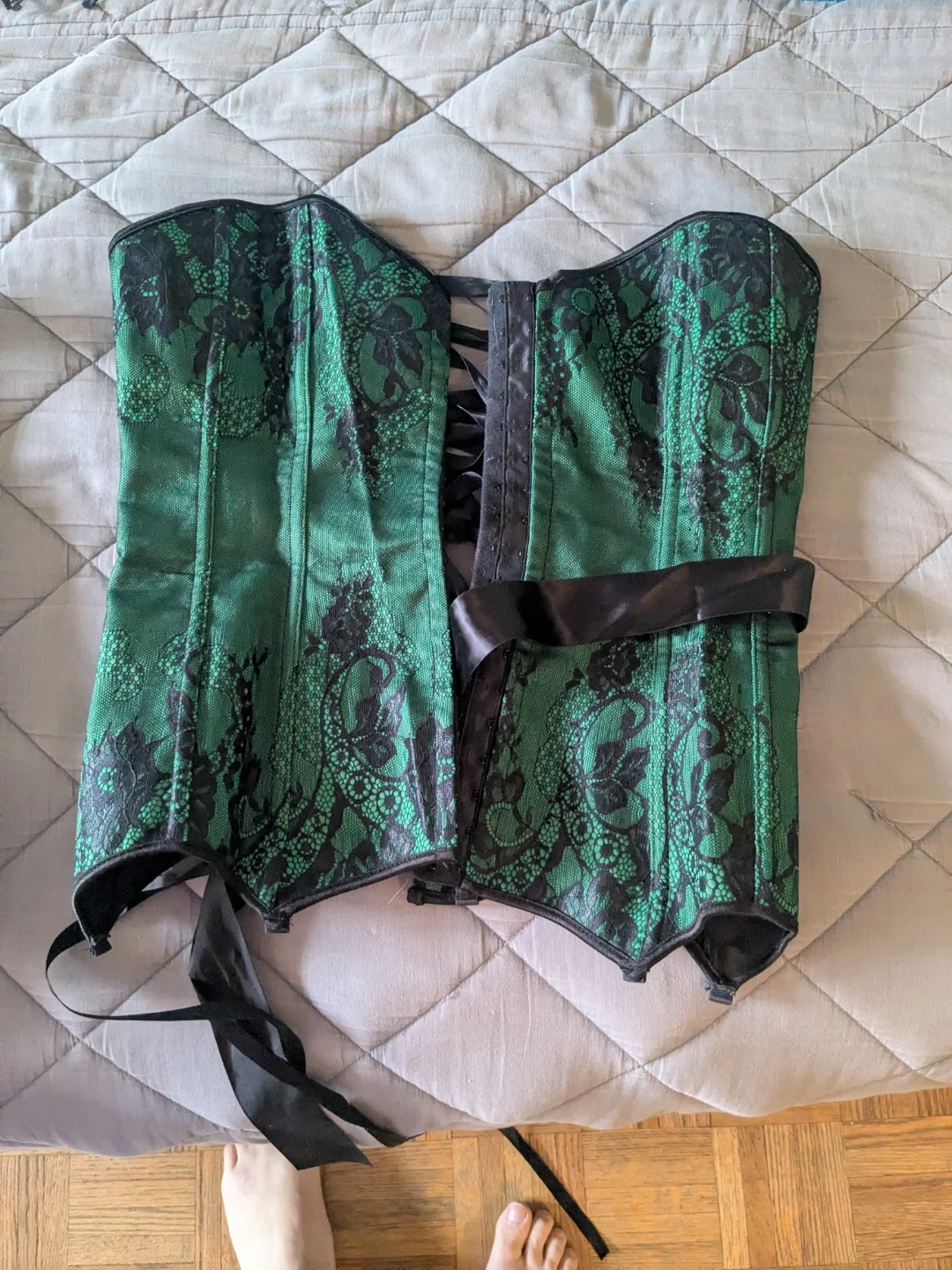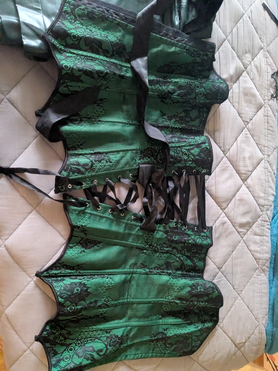10Selling a Coquette corset in a beautiful green and black colour scheme! It's a size large and features lovely lace detailing. Perfect for adding a touch of elegance to any outfit! Worn twice, for costume live art modelling.