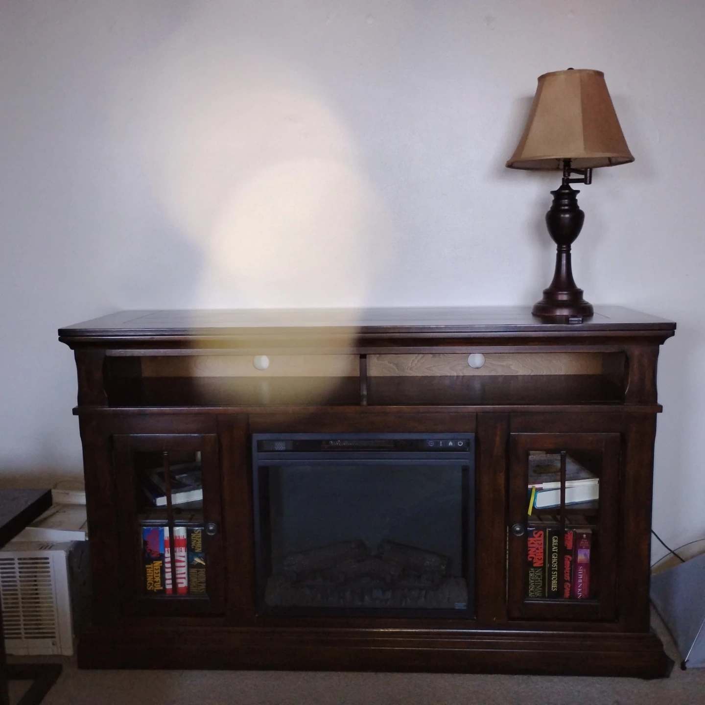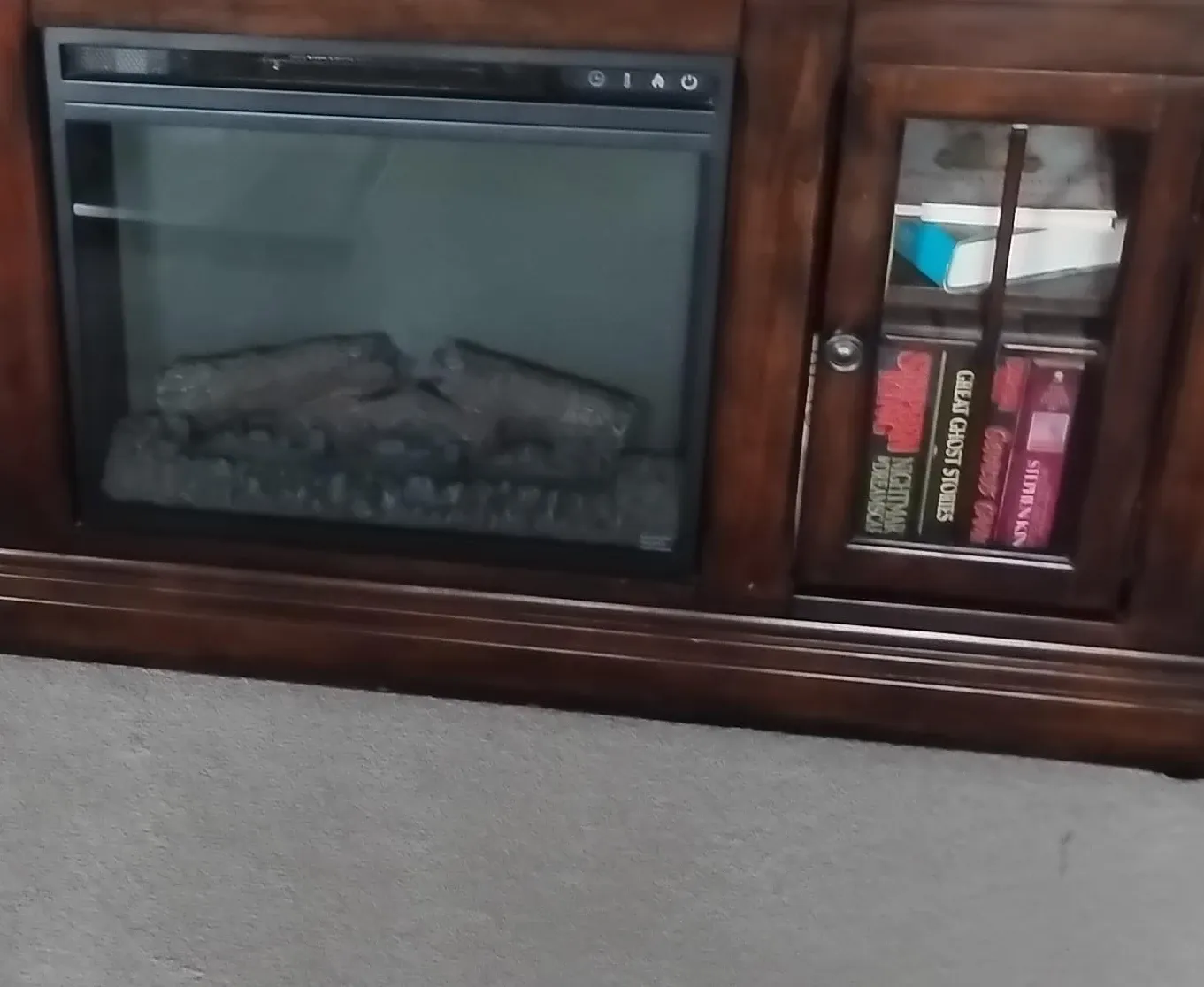 Selling a fireplace TV stand. It's in great condition and has storage on either side of the fireplace. Perfect for cozy nights in!