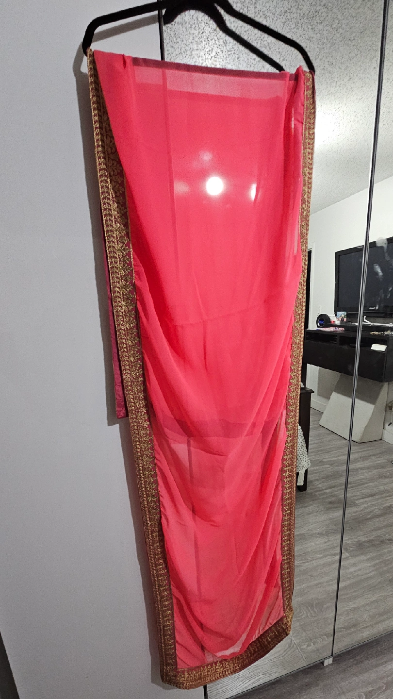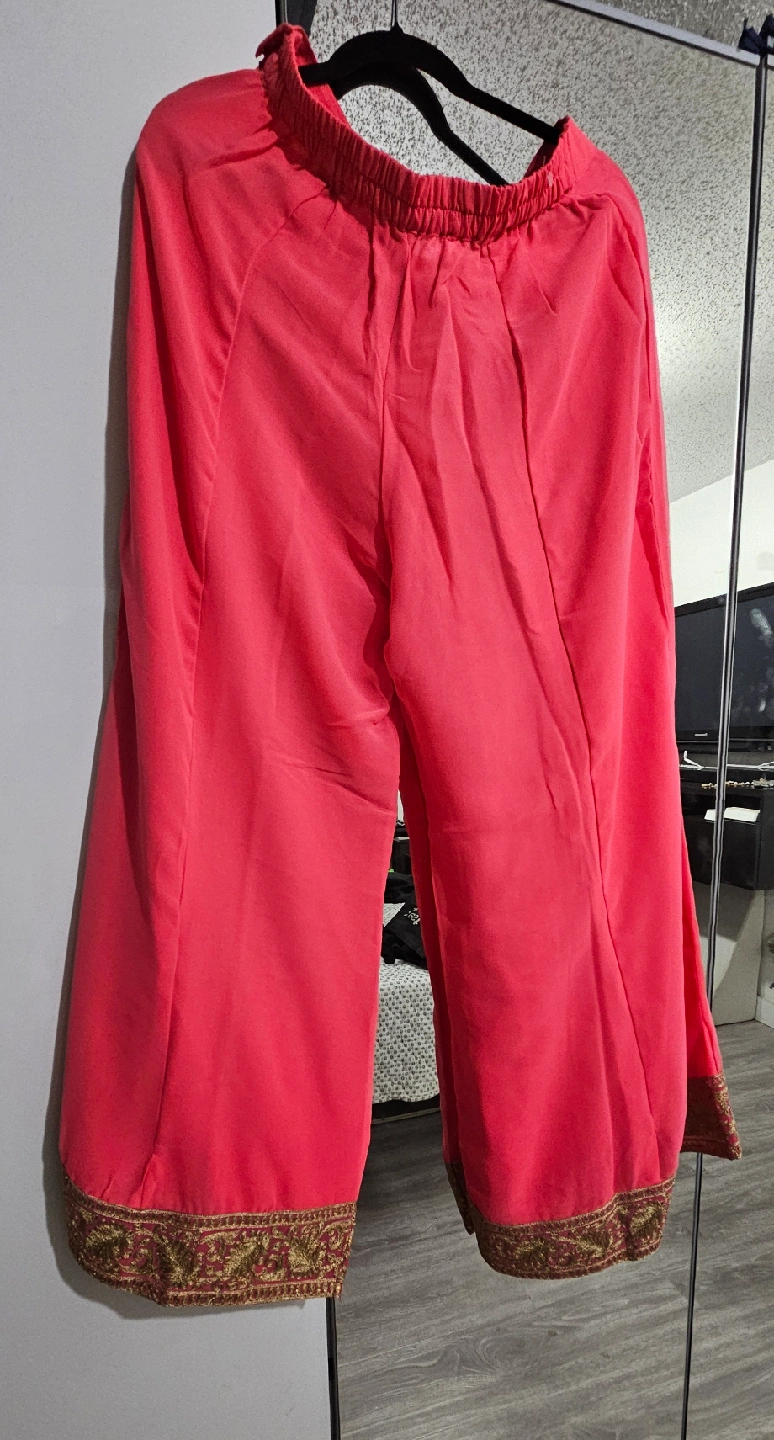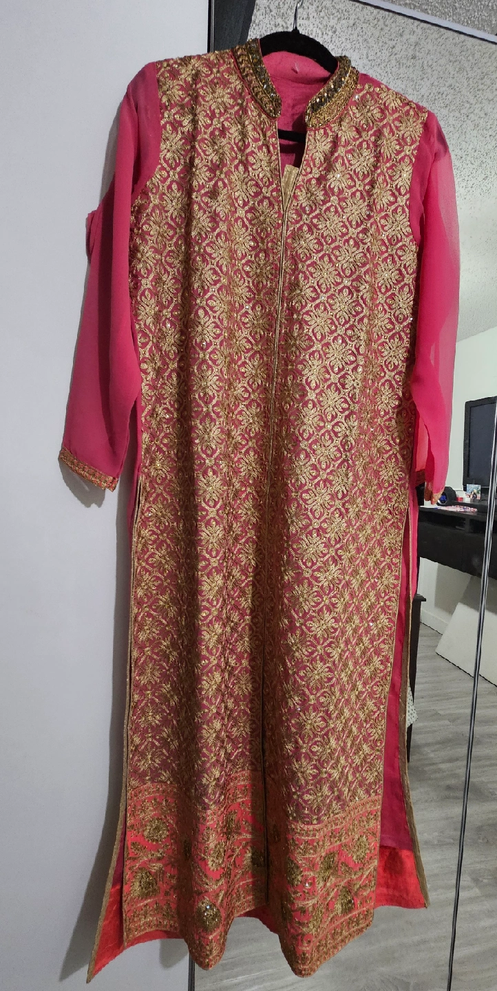 5Beautiful coral-coloured Salwar Kameez suit with gold embroidery! The set includes a long top, wide-legged pants, and a matching dupatta. Perfect for a special occasion or festive event!