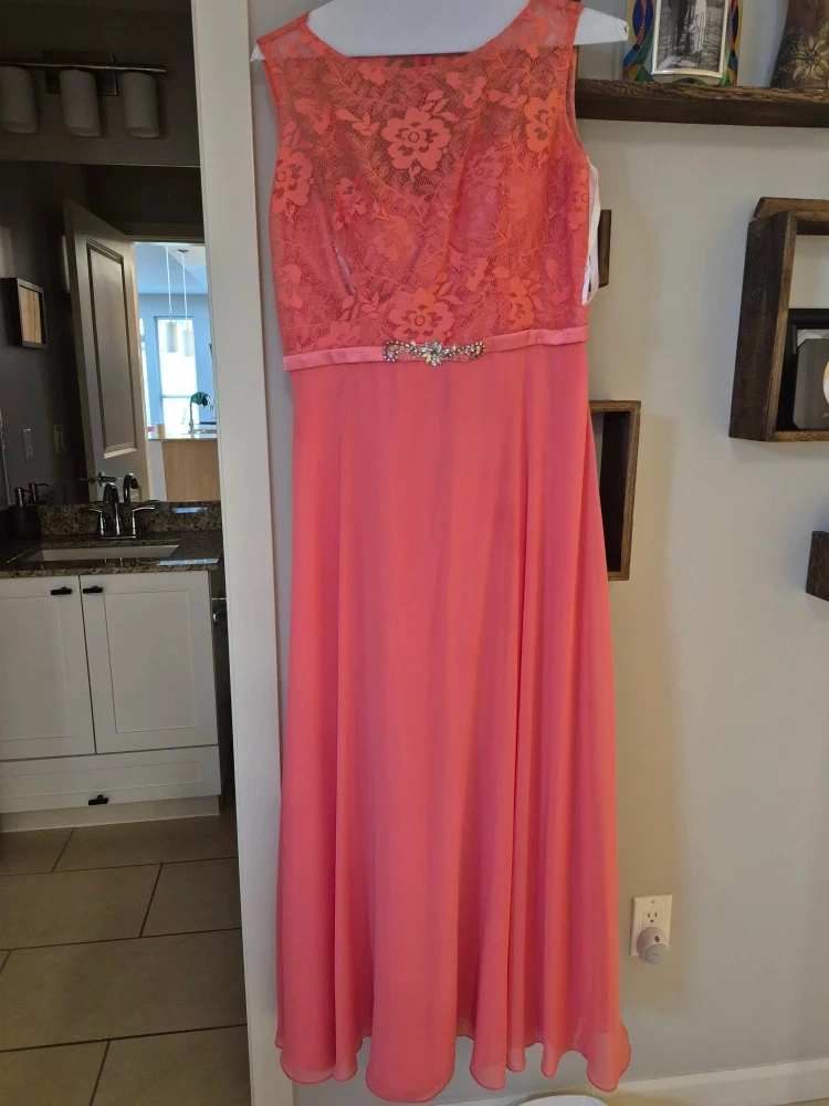 88Selling a beautiful coral-coloured formal dress with a lace top. It features a delicate rhinestone detail at the waist. Perfect for a special occasion! worn once