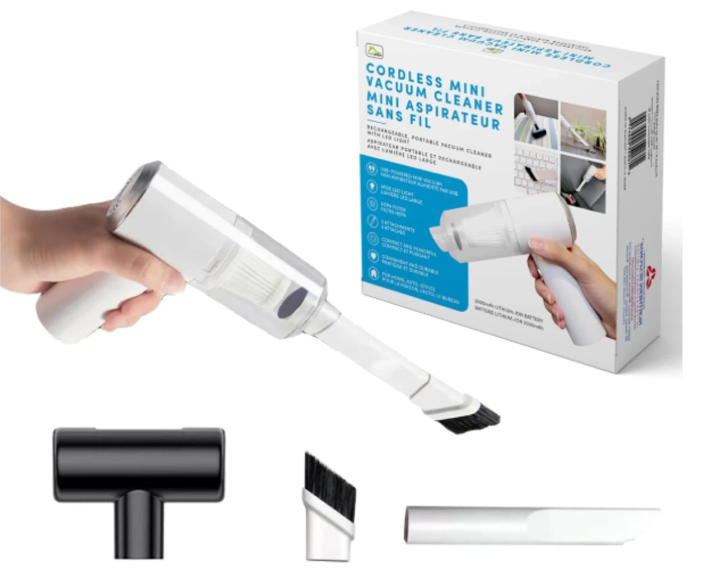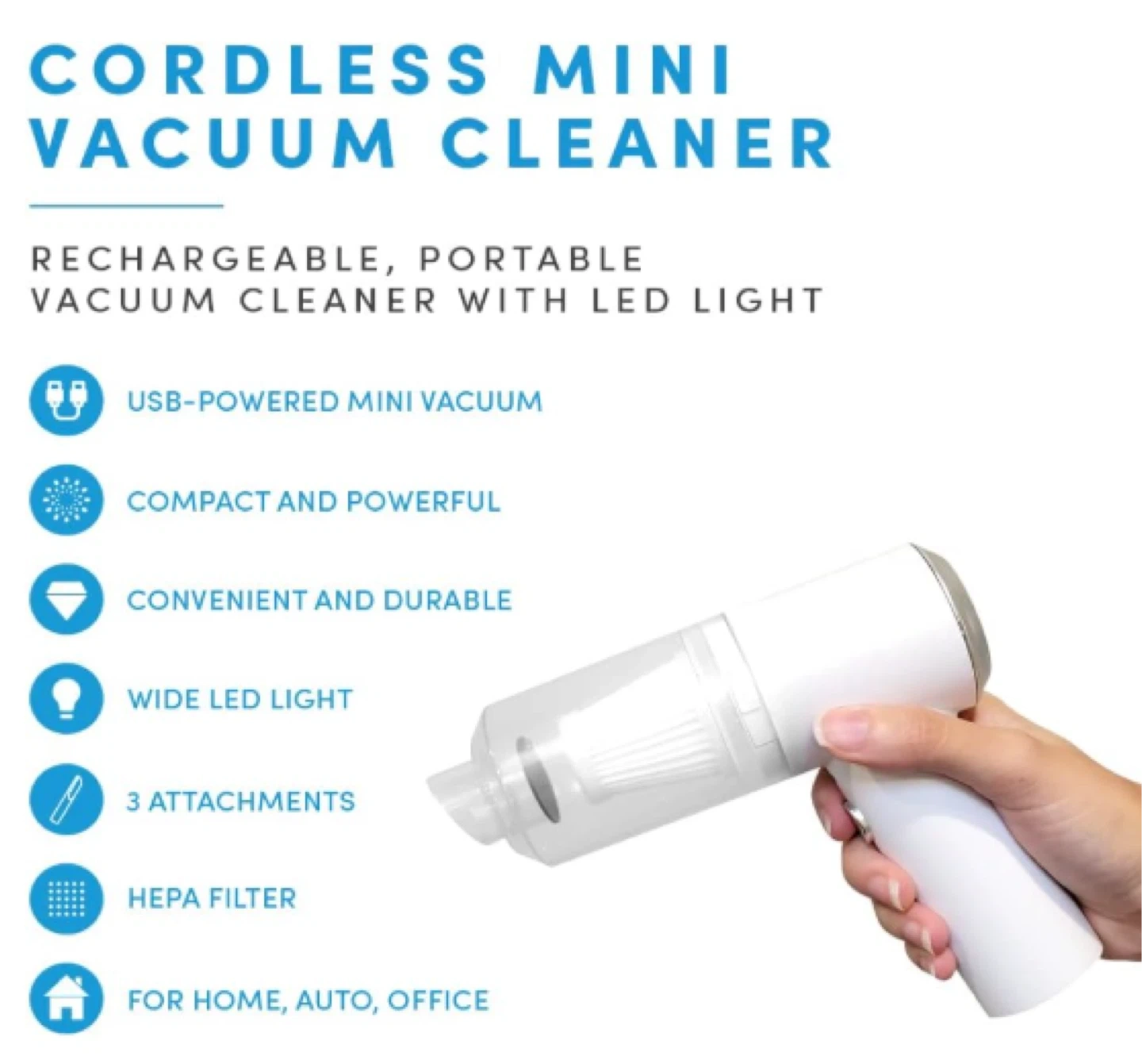 Used Condition | USB Rechargeable | Strong Suction | LED Light | Includes 3 Attachments | Portable ✅ Compact Yet Powerful Small in size but strong on suction—perfect for quick clean-ups on car seats, sofas, desks, or pet hair. Designed for spot messes, not full-room cleaning. ✅ Cord-Free Convenience Rechargeable 2000mAh battery delivers up to 20 minutes of cleaning time. No cords, no hassle—just grab and go. ✅ Smart Cleaning Features Built-in LED light and included crevice tool let you reach tight corners, under seats, and between cushions with ease. ✅ Lightweight & User-Friendly Ergonomic, easy to handle, and gentle on the hands—suitable for all users, including those with limited hand strength.