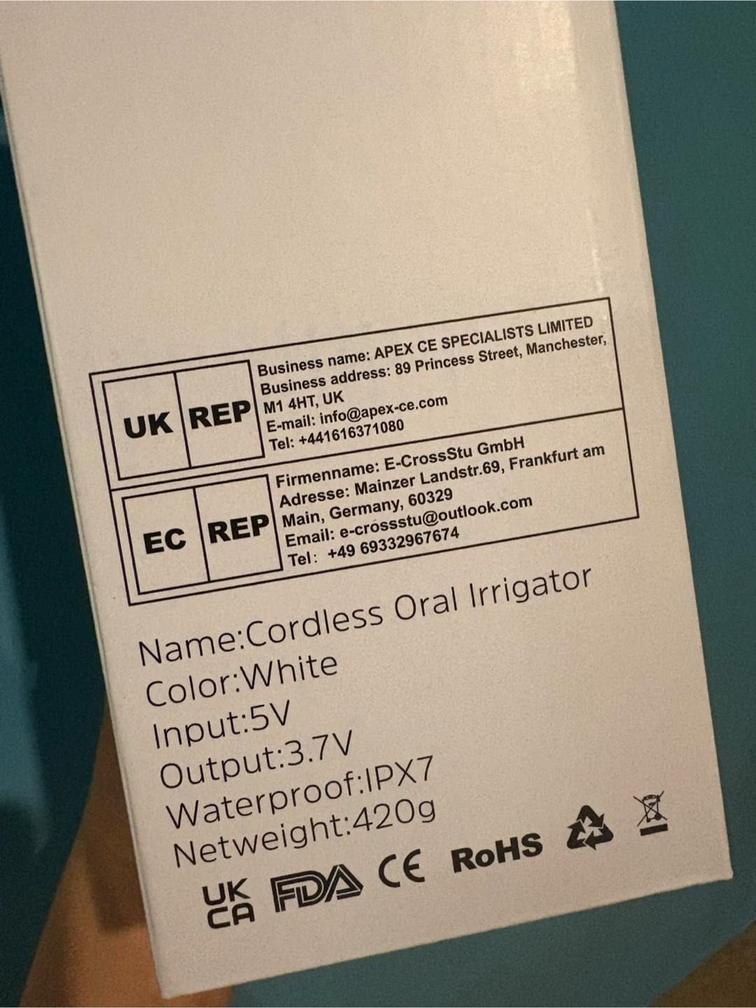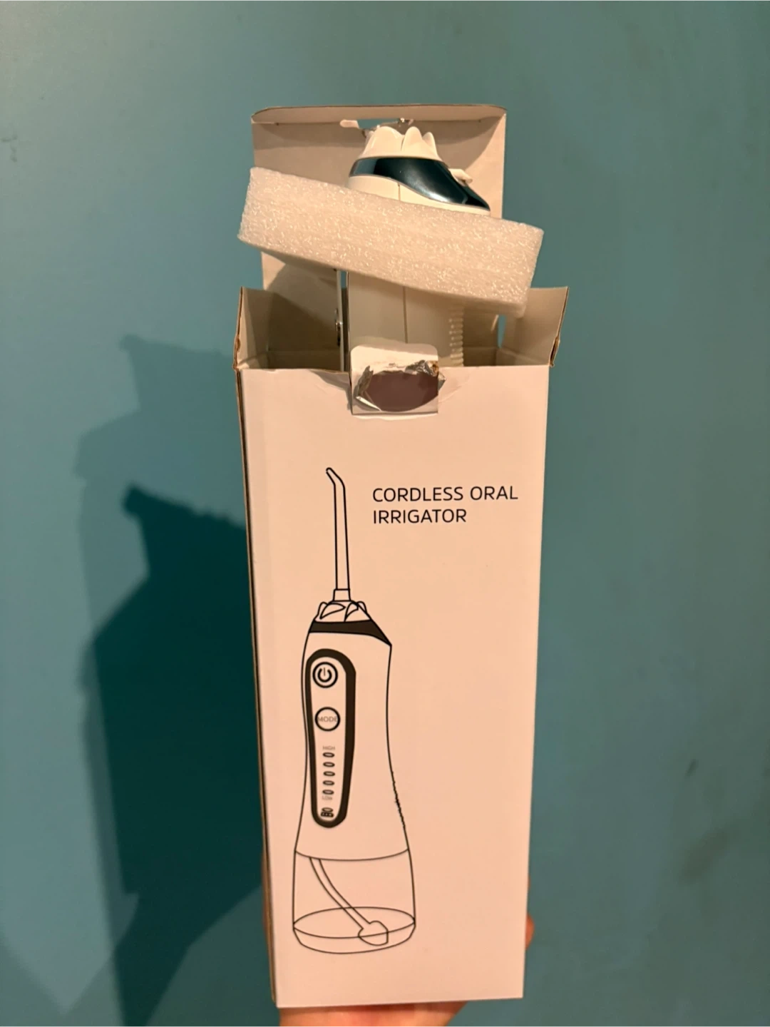22Selling a brand new cordless oral irrigator! It comes in its original box. Just opened for checking. This oral irrigator is white and waterproof with an IPX7 rating. It weighs 420g. Perfect for maintaining your oral hygiene at home!