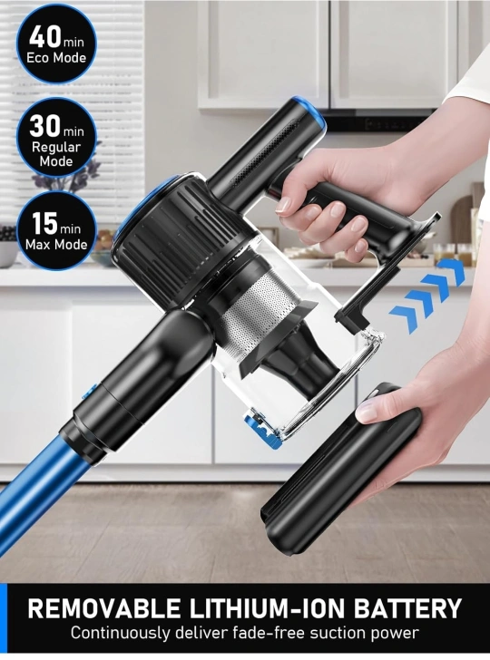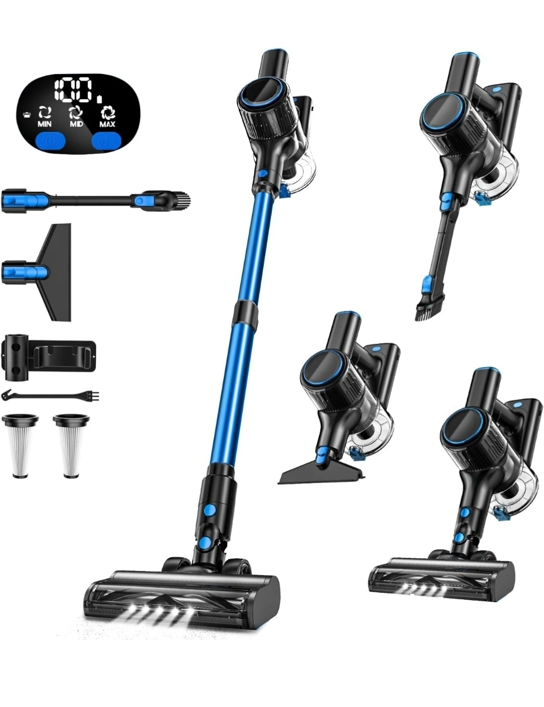 Lightweight and powerful cordless stick vacuum. Multiple attachments included for versatile cleaning. LED display shows battery life and cleaning mode. Long battery life, up to 40 minutes on eco mode. Anti-tangle roller brush. Ideal for pet owners.