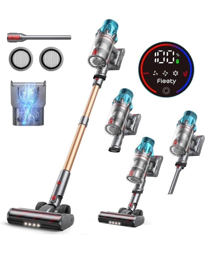 Vacuum cleaner, comes with various attachments, features a digital display, a charging dock, and additional filters. Has LED lights on the head.