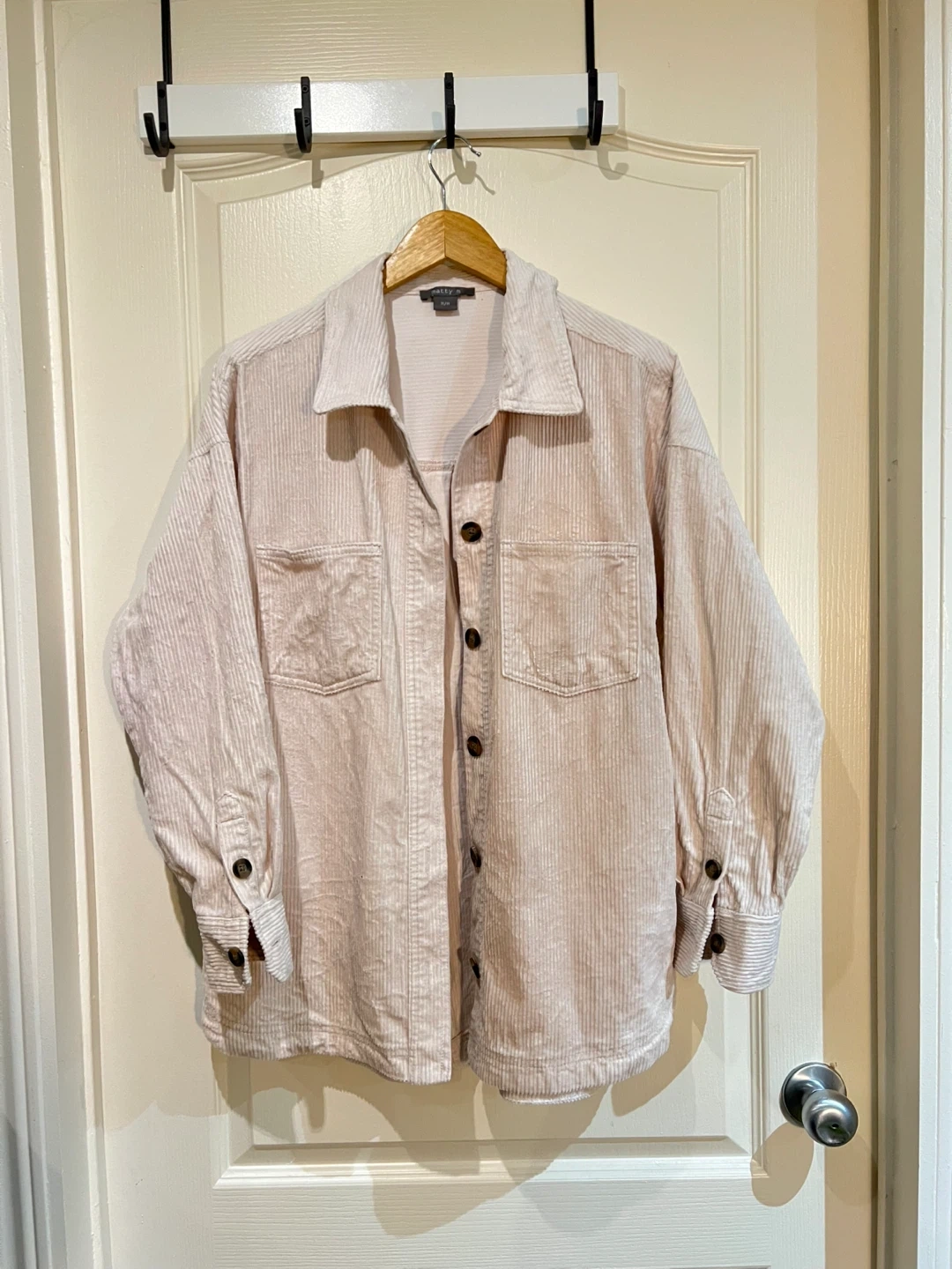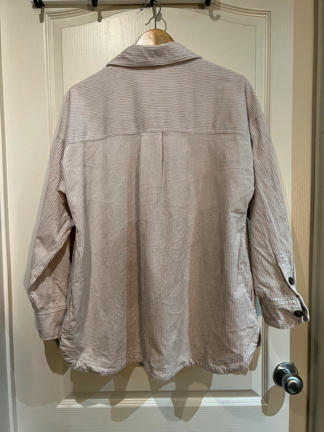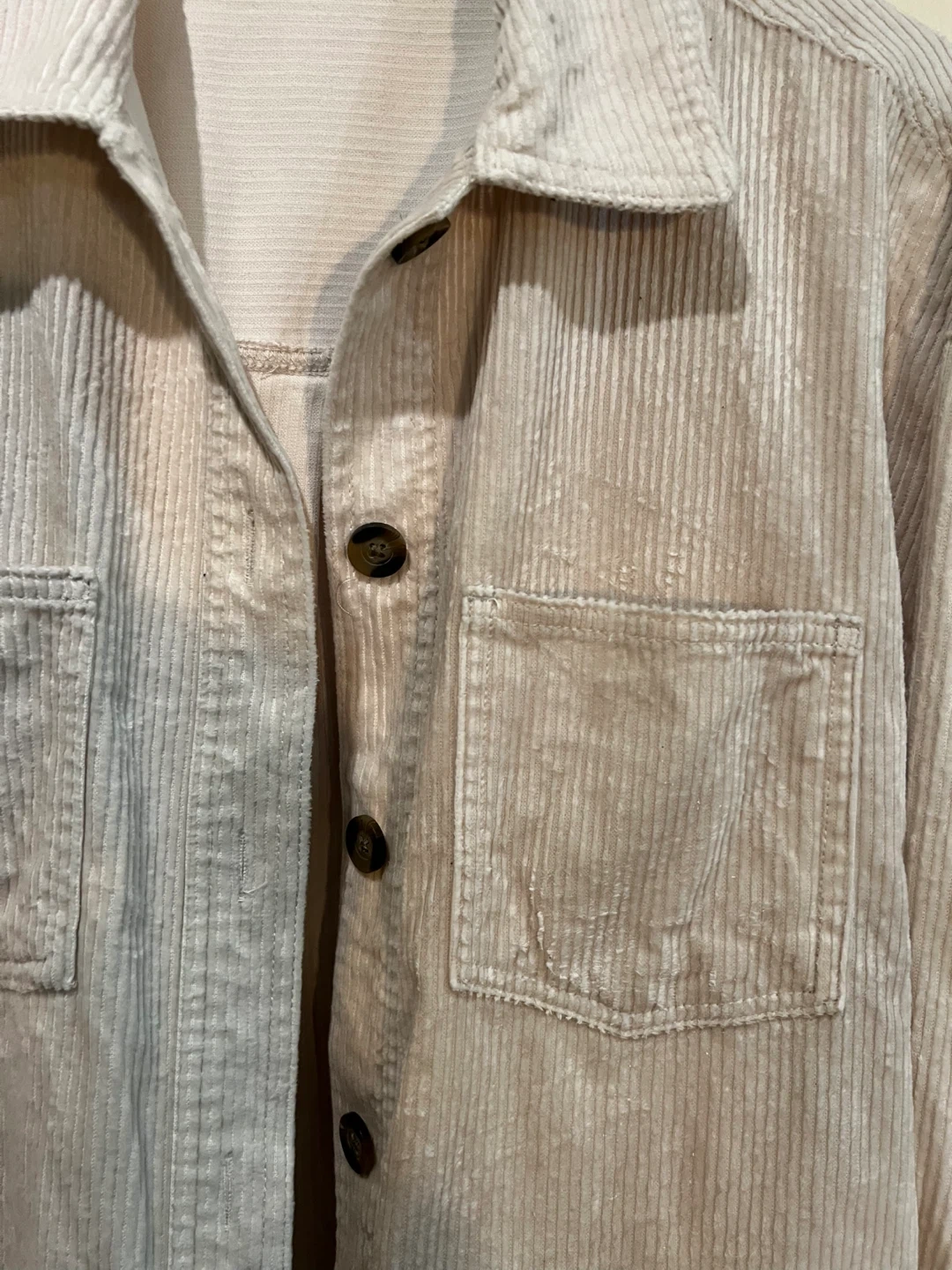 Cozy corduroy shacket in a neutral colour. This button-up is perfect for layering! It's in great condition and ready for a new home. Size medium