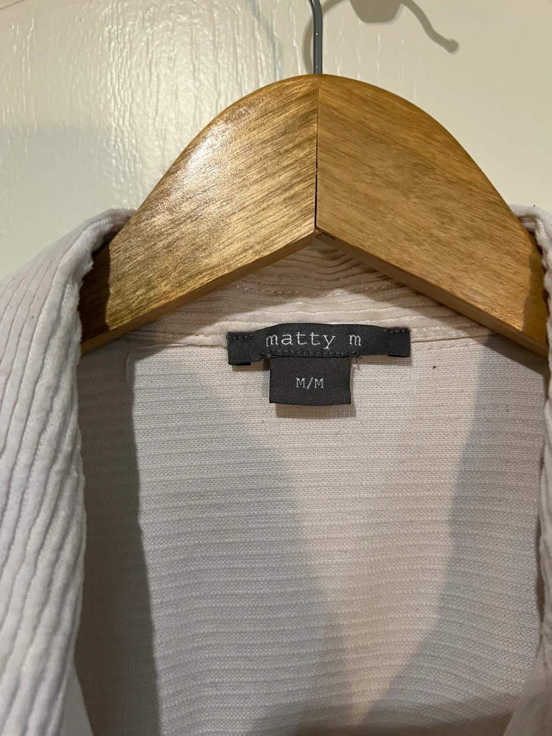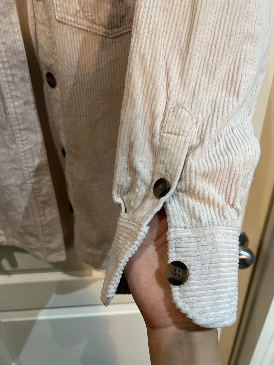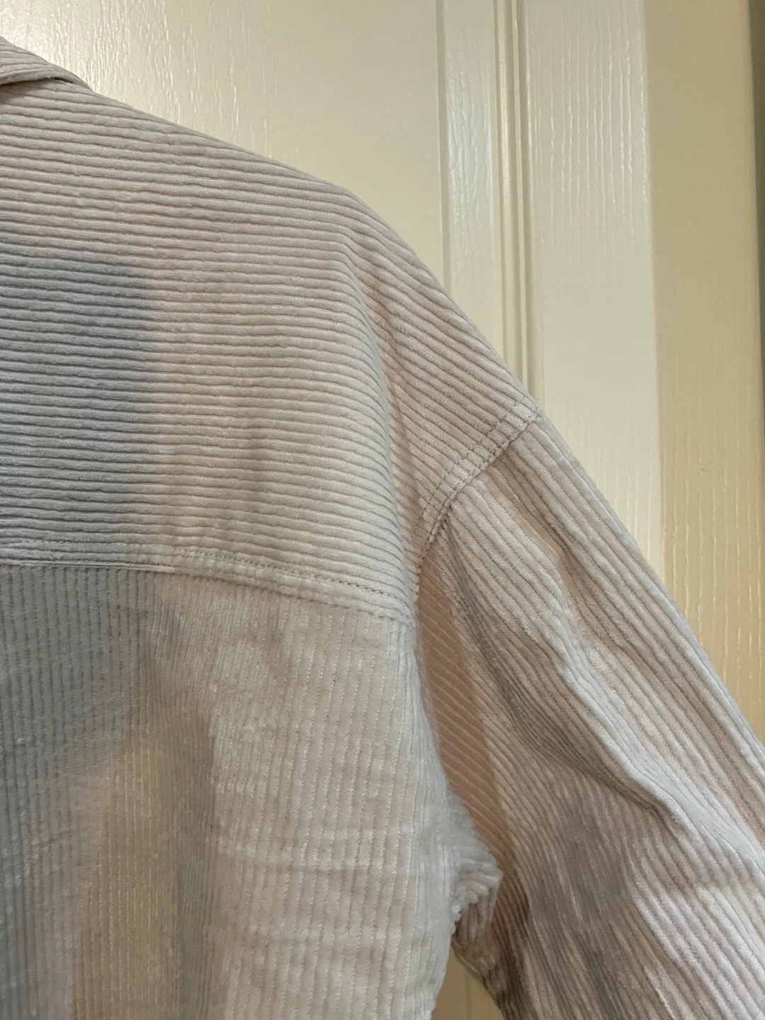 Cozy corduroy shacket in a neutral colour. This button-up is perfect for layering! It's in great condition and ready for a new home. Size medium