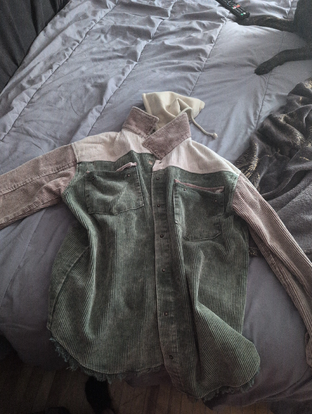 Selling a corduroy button-up shirt with a unique colour block design! It features green, beige, and brown panels. The shirt has a relaxed fit and a soft, textured feel. Perfect for layering or wearing on its own!