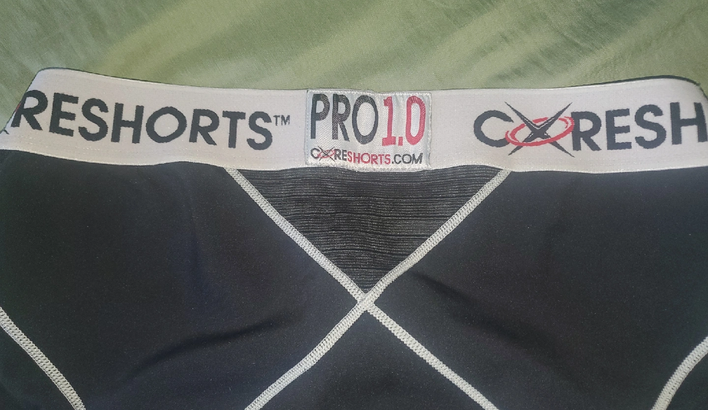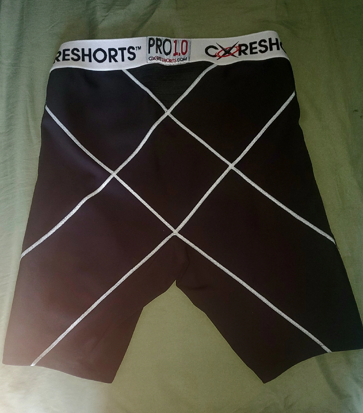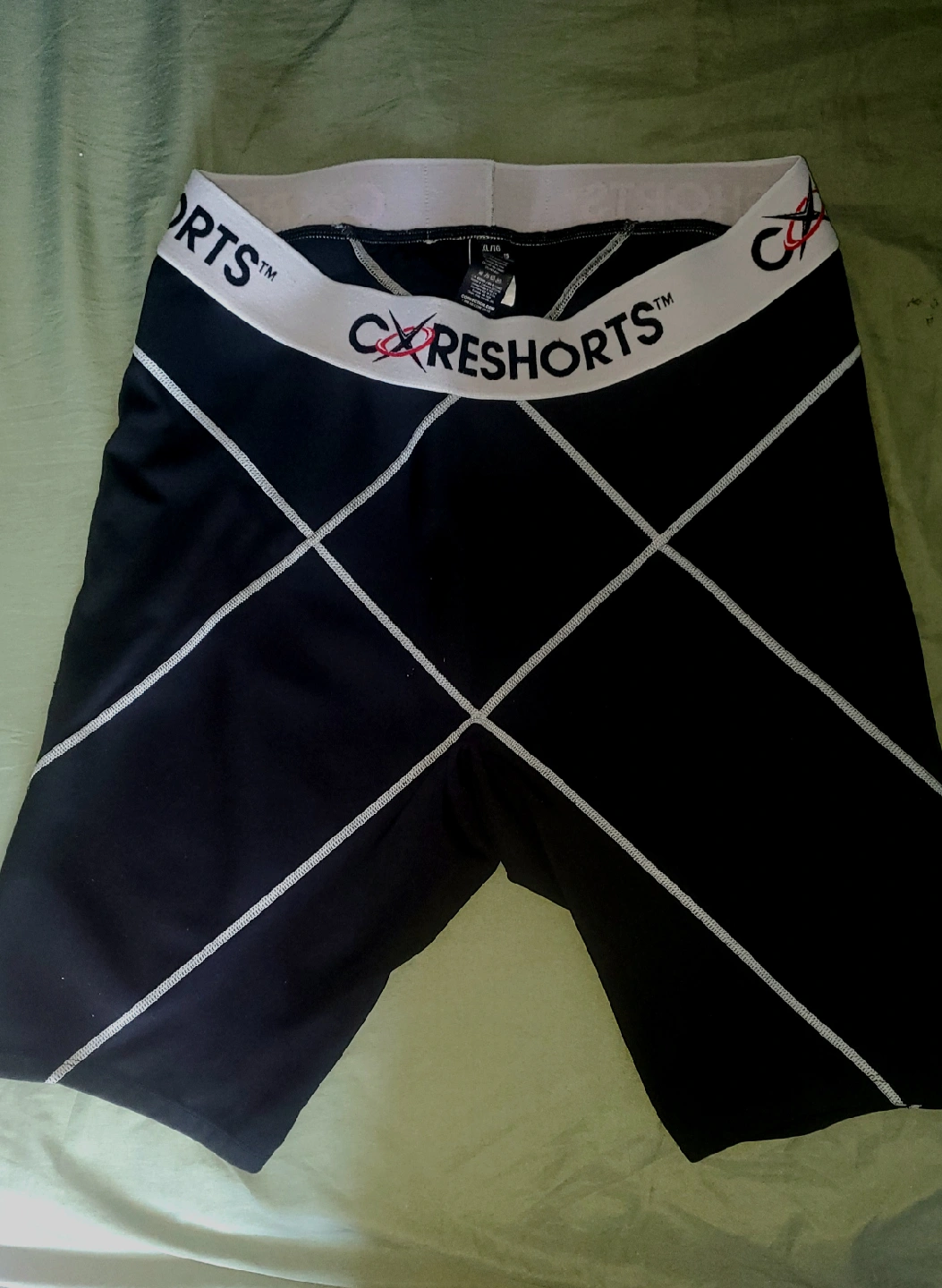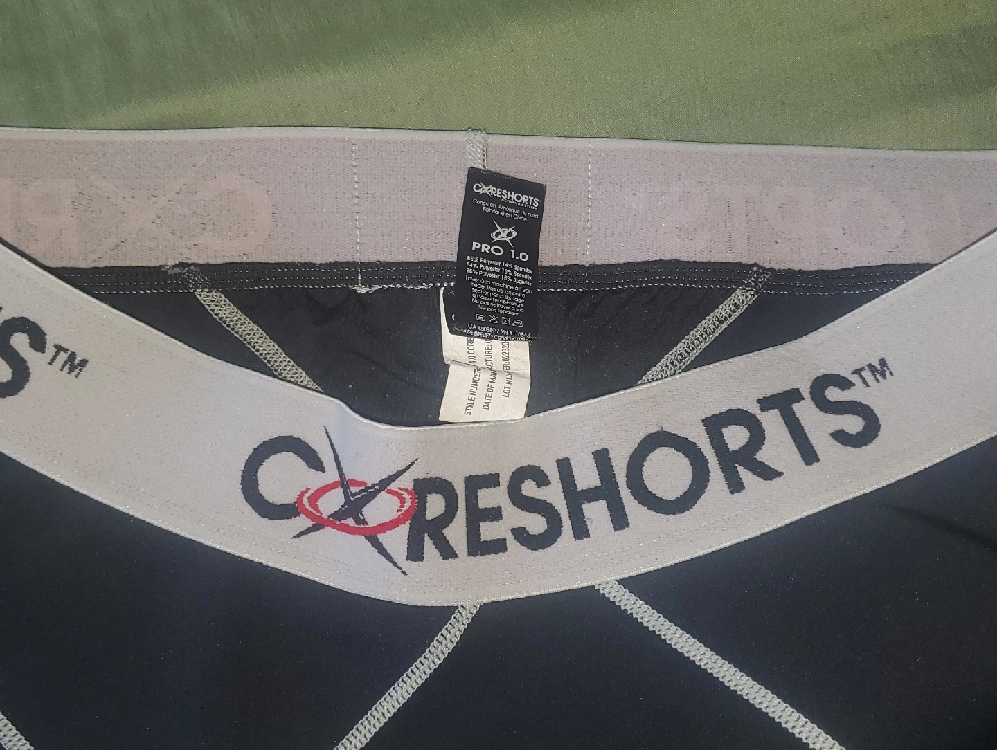45Selling a pair of CORESHORTS PRO 1.0 men's shorts in black, size XL. They have a stylish design with white accents. Not used, doesn't fit me as I want.