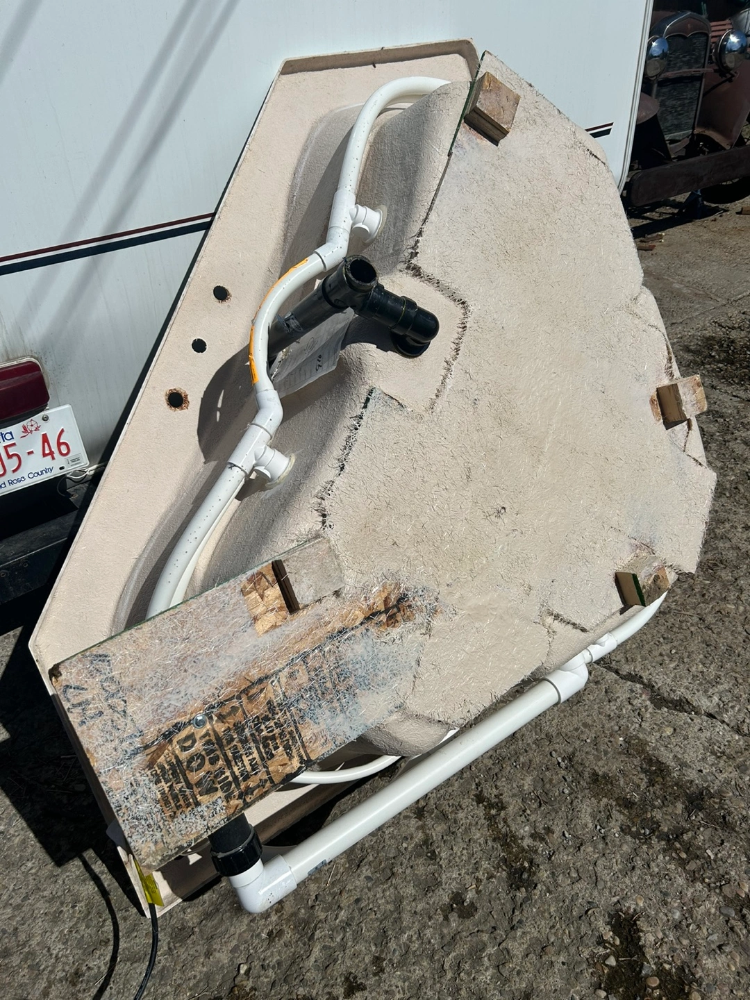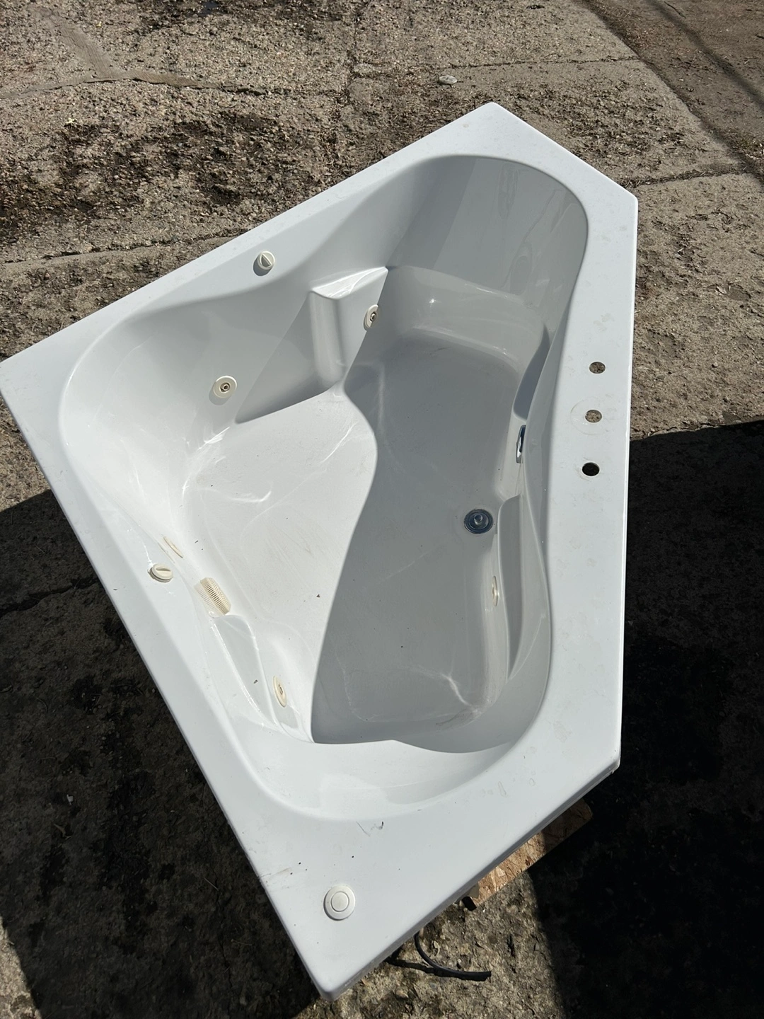 Selling a corner bathtub. It's in good condition and ready to be installed in your bathroom. Perfect for a relaxing soak! Everything works . Installed bigger one so this one is not needed . This will be here for Sunday only . Free today