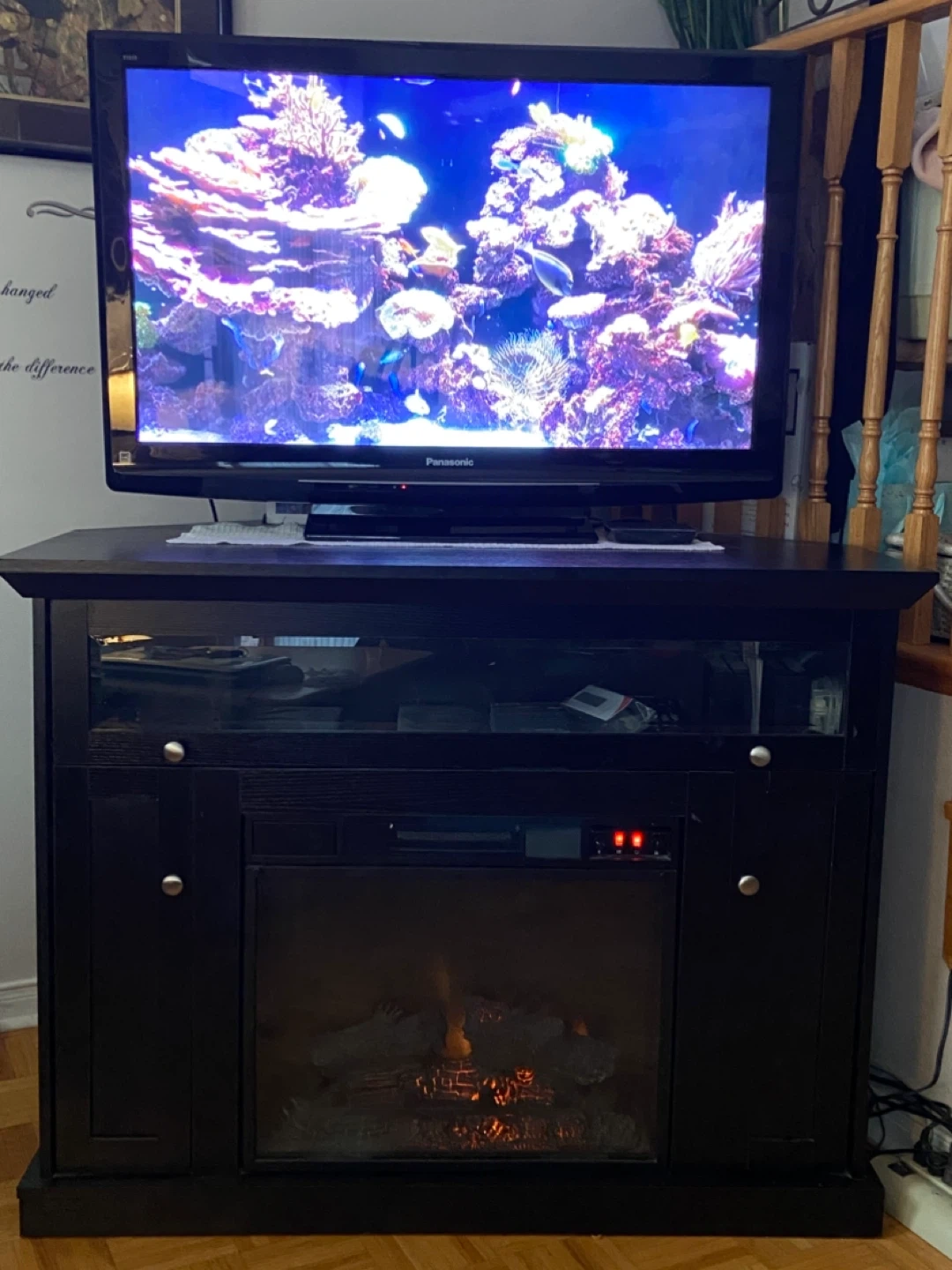 56Spruce up your living space with this sleek corner fireplace TV stand, perfect for TVs up to 55 inches. The unit features a realistic flame effect with adjustable settings for heat and flame brightness. This item is in good used condition. Additional Features: * Electric fireplace insert with a realistic flame effect - use with or without heat. * Adjustable heat settings to keep your room cozy. * Storage cabinets with doors for added convenience to store other entertainment items. * Top shelf for media components or decor. Bring warmth and style to your home with this charming fireplace TV stand. Please note that the TV is not included. Pick up in Maple area - Jane & Teston