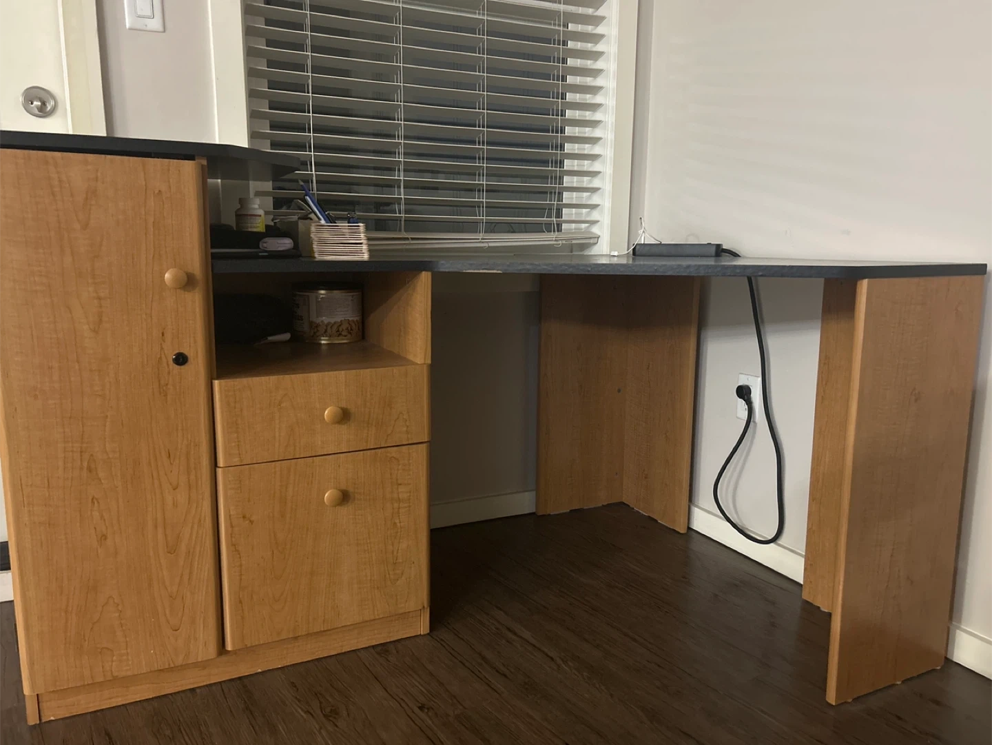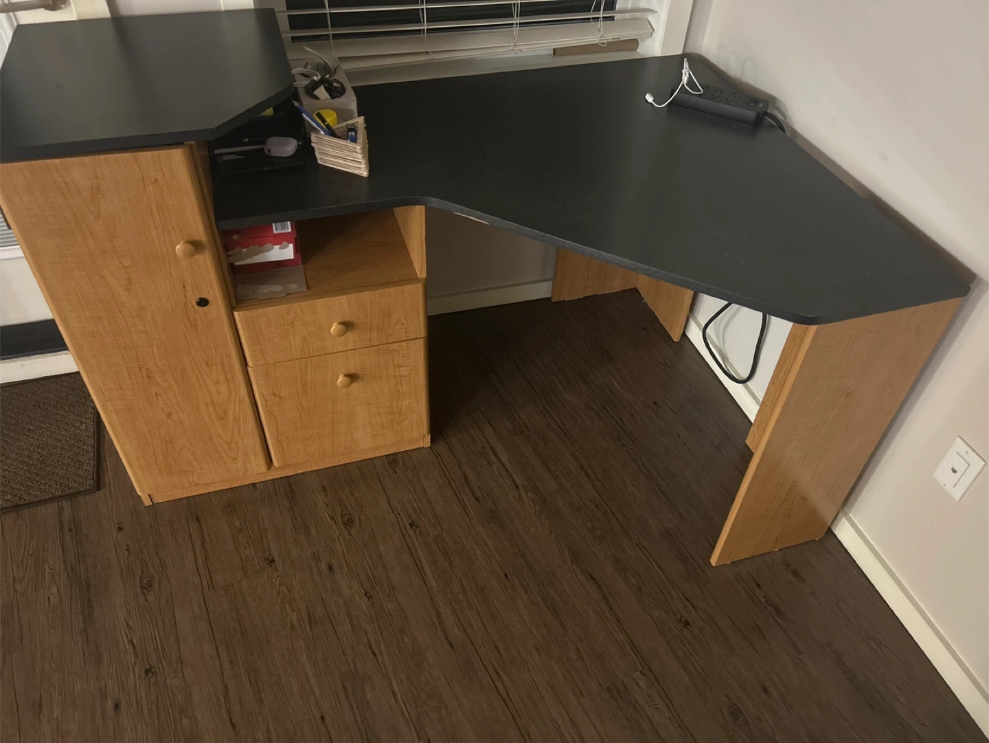 10Selling a corner desk with built-in storage. It features a black top and light wood-tone base, providing a stylish and functional workspace for your home or office. Perfect for maximizing space!