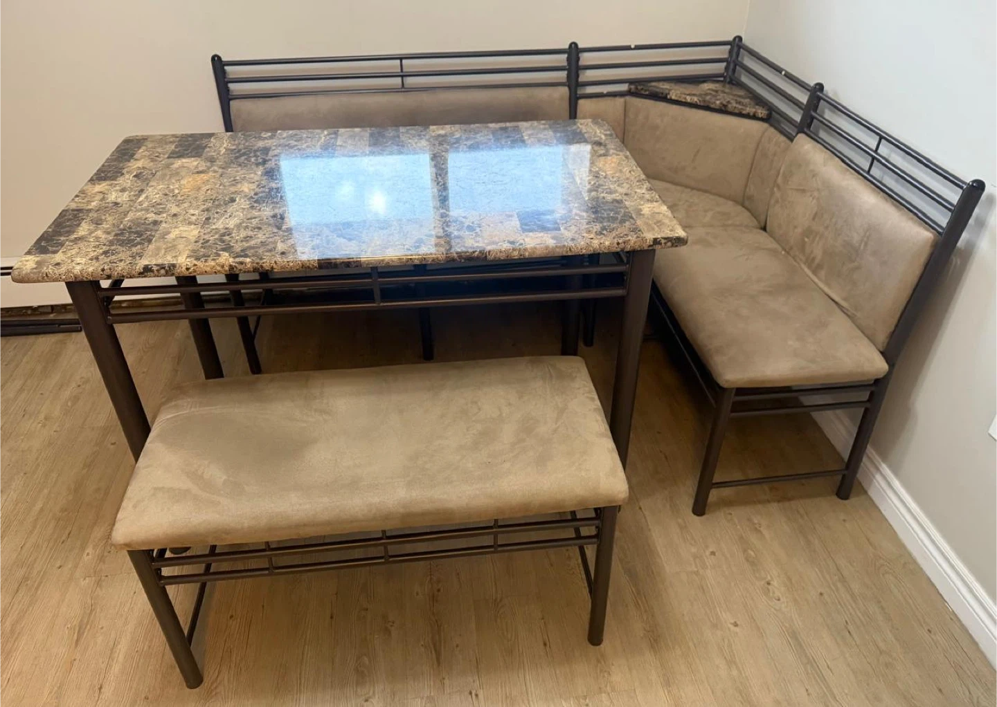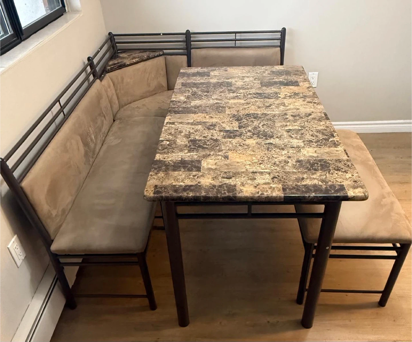 9Selling a corner dining set that includes a table, bench, and corner seating. The set features a faux marble tabletop and a metal frame with upholstered seating. It's in great condition and perfect for a smaller dining space or kitchen nook!