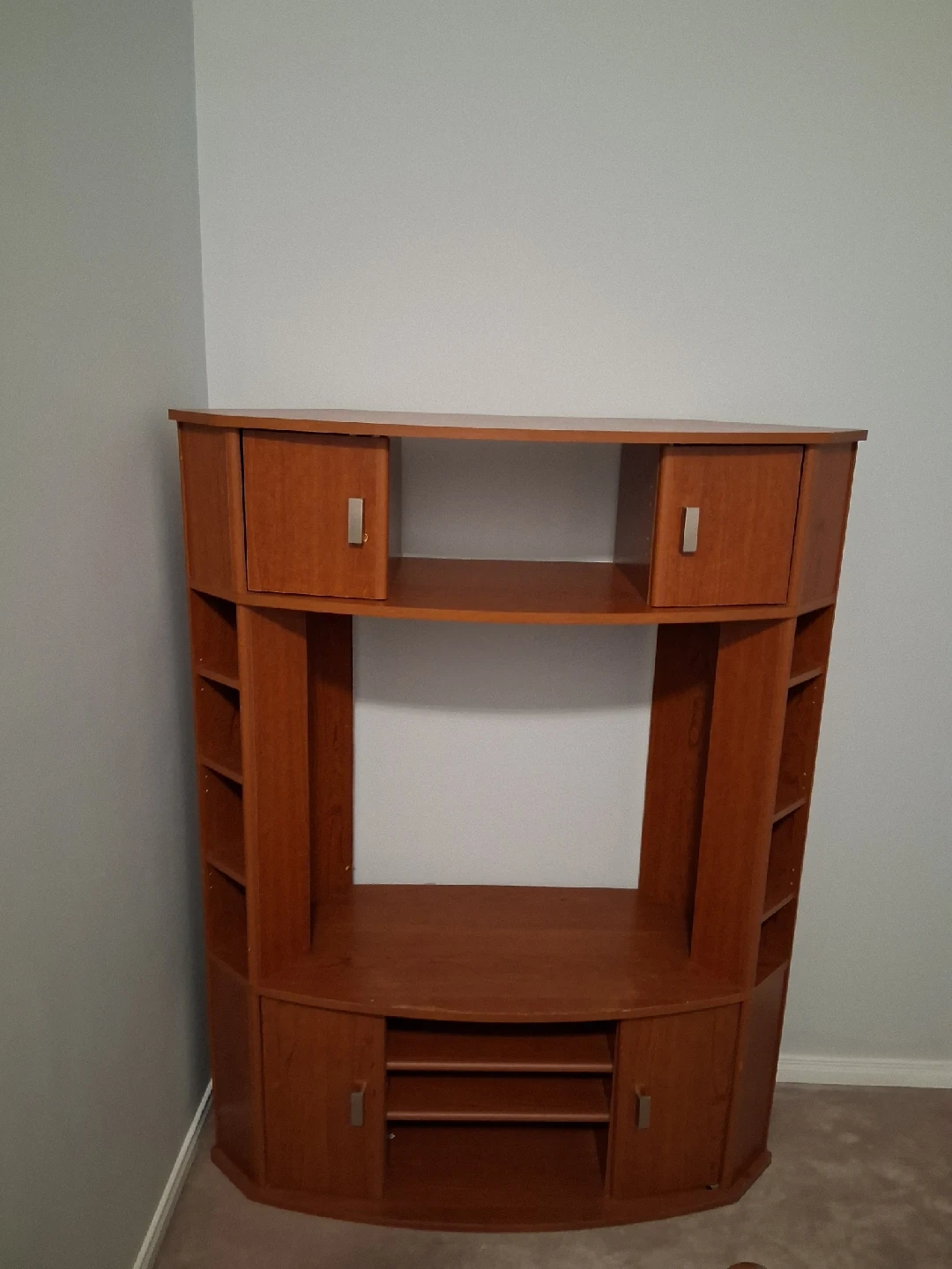 60Corner entertainment center in good condition! It's a warm wood tone with lots of storage. Perfect for a TV and all your media needs, or to display your favourite things