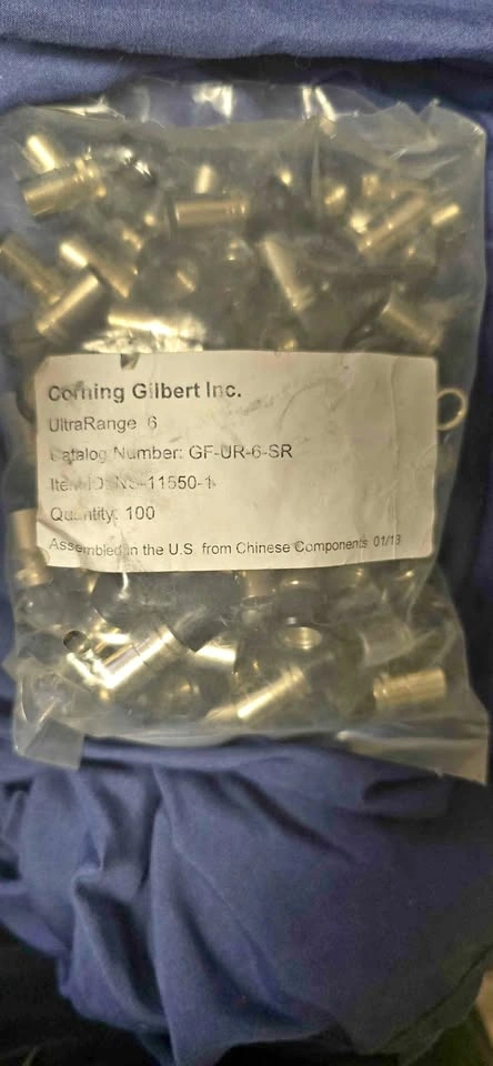 10Condition: New The Corning Gilbert GF-UR-6 is a high-performance compression F-connector designed for RG6 coaxial cables. Part of the UltraRange® series, this connector is engineered to provide reliable and efficient terminations in various applications. Key Features: One-Piece Design: Eliminates loose parts, allowing for rapid and consistent connectorization without the risk of misalignment. Free-Spinning Sealed Nut: Incorporates a free-spinning 7/16" nut with an O-ring seal, facilitating faster and more reliable installations. 360° Radial Compression: Provides complete contact to the cable, ensuring excellent RF shielding integrity and a moisture-resistant seal to the cable jacket. Universal Fit: Compatible with a range of cable types from 60% braid to quad-shield, reducing the need for multiple connector types Standard Tool Compatibility: Designed for use with standard compression tools, simplifying the installation process