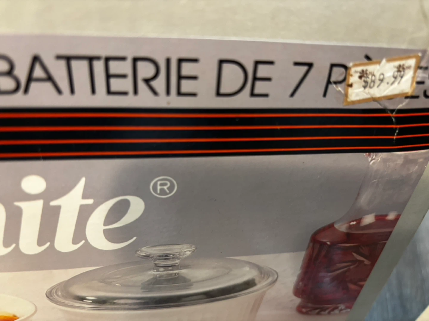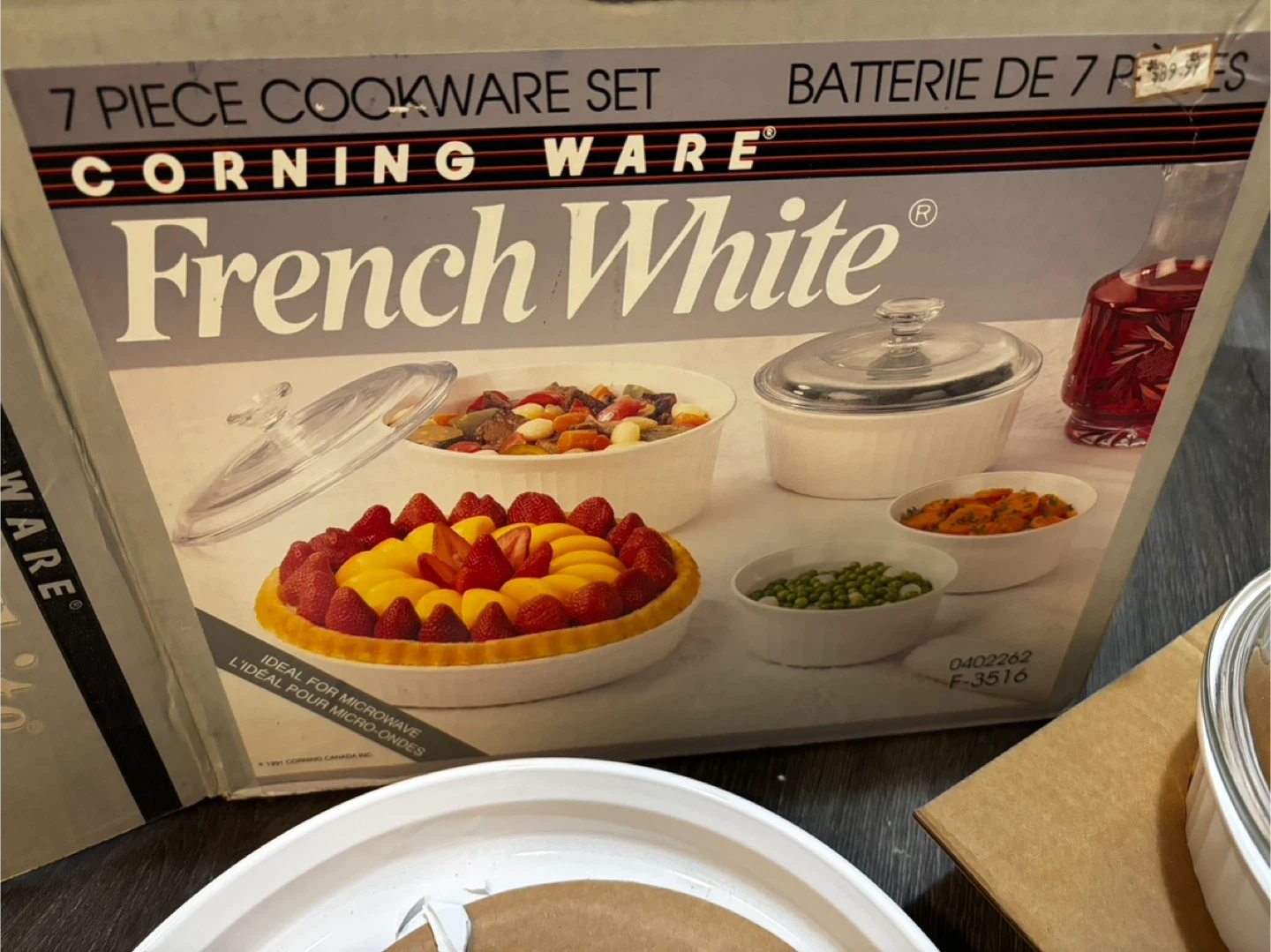 70Selling a CorningWare French White 7-Piece Cookware Set Comes with the original box. It was originally purchased for $89.99. It’s missing one small piece, but the rest of the set is complete. Never used. Great for baking, cooking, and serving! Cash only Pick it up only in Goldwin ave, York on No delivery