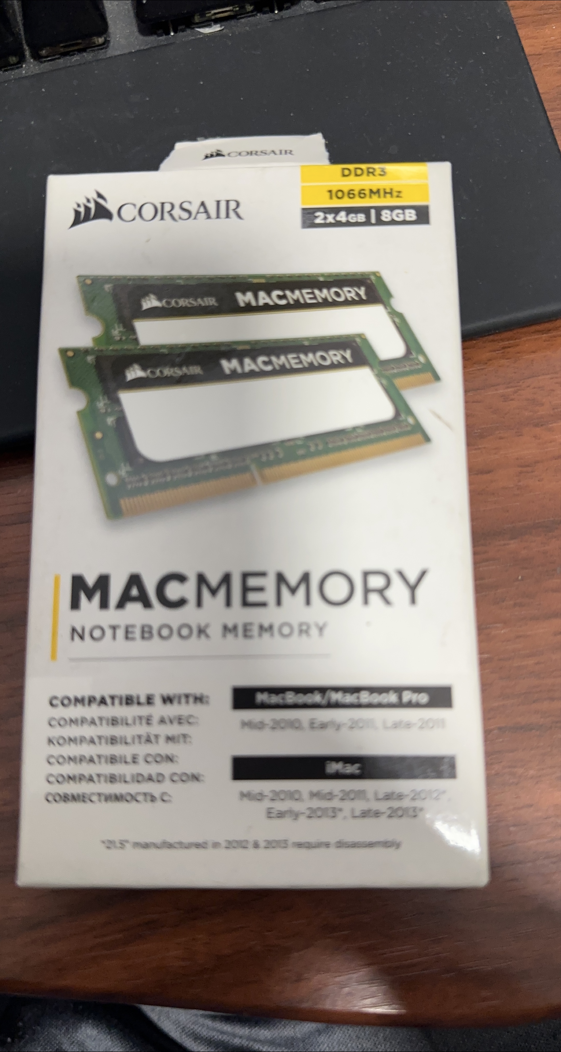 9Selling a Corsair MacMemory DDR3 RAM kit, perfect for upgrading your older Mac! This kit includes two 4GB sticks, for a total of 8GB. It's compatible with various MacBook, MacBook Pro, and iMac models from 2010 to 2013.