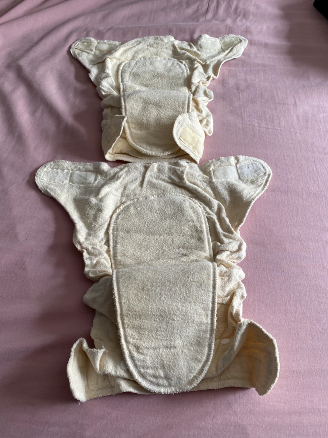 Two reusable organic cloth diapers. These diapers are made with natural fibres and feature closures for a snug fit. They have the extra liner inside. They're great for eco-conscious parents looking for a sustainable diapering solution. These sell new for $20 each. Take both for $5!
