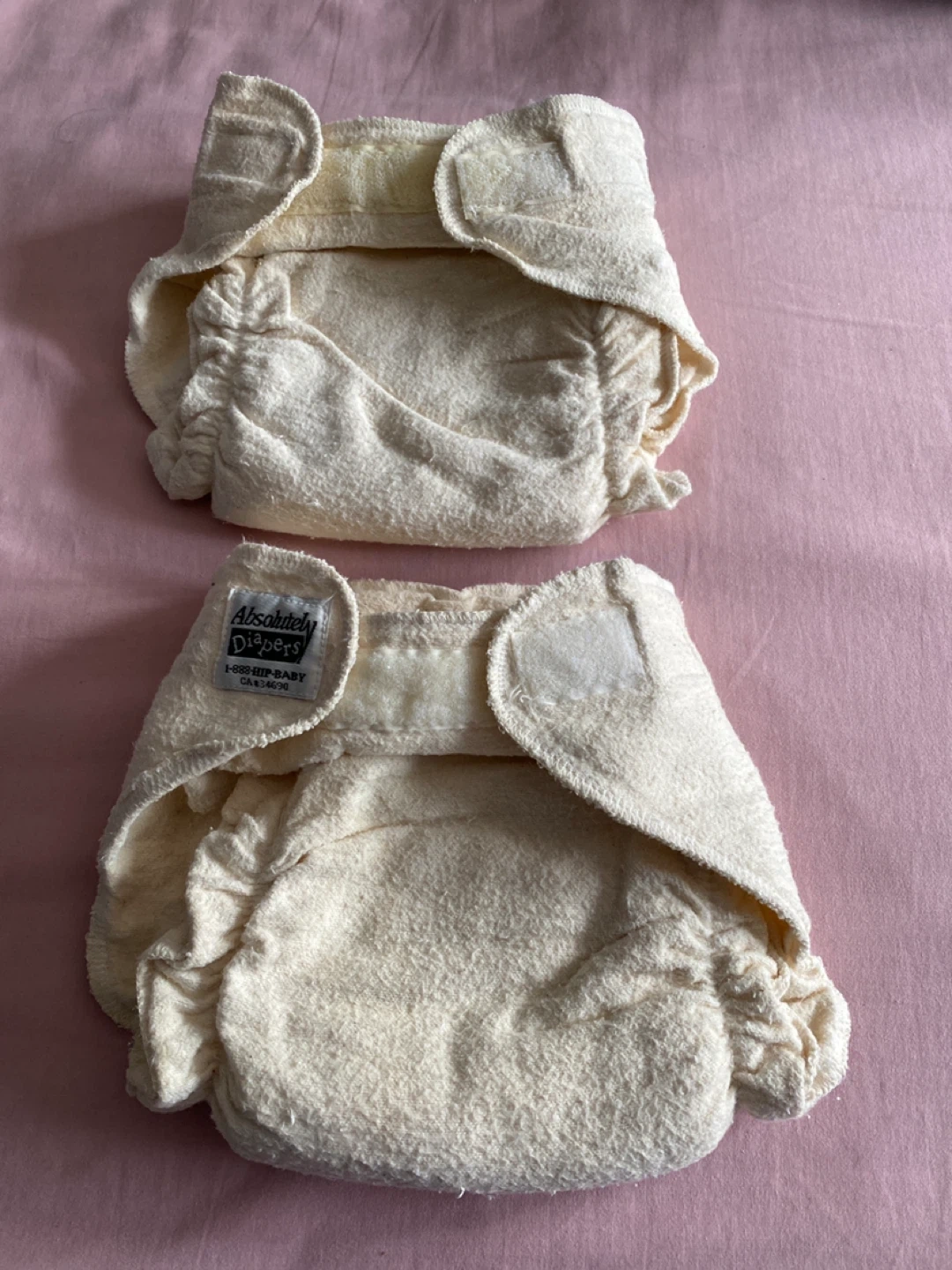 Two reusable organic cloth diapers. These diapers are made with natural fibres and feature closures for a snug fit. They have the extra liner inside. They're great for eco-conscious parents looking for a sustainable diapering solution. These sell new for $20 each. Take both for $5!