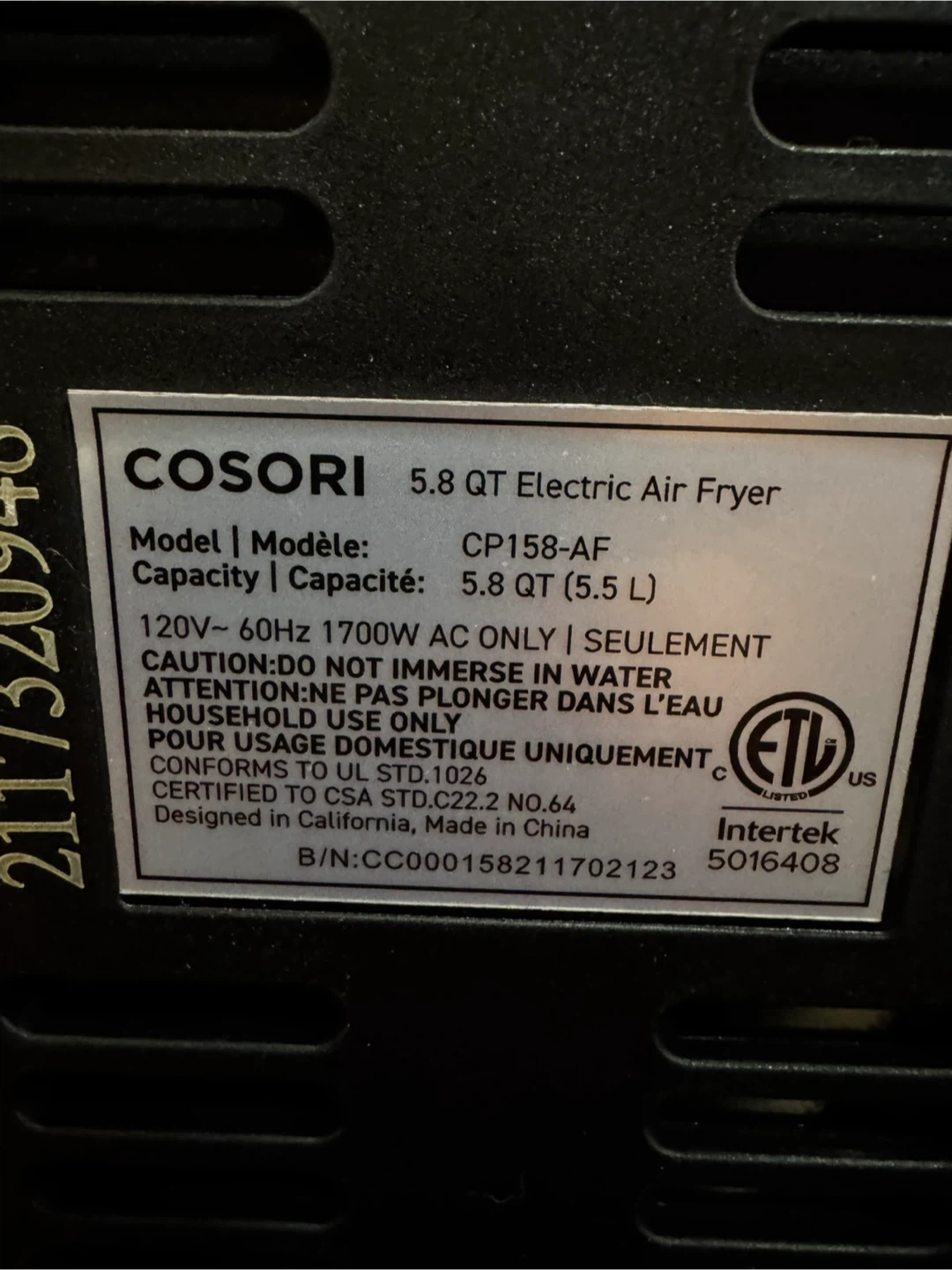 563Cosori 5.8 quart electric air fryer in very good condition, perfect for making crispy and delicious meals with less oil. Additional specifications: * Brand: Cosori * Capacity: 5.8 quarts (5.5 litres) * Model: CP158-AF * Power: 1700W * Features: Digital touchscreen, preset functions, preheat, shake reminder $45 Yonge and finch area