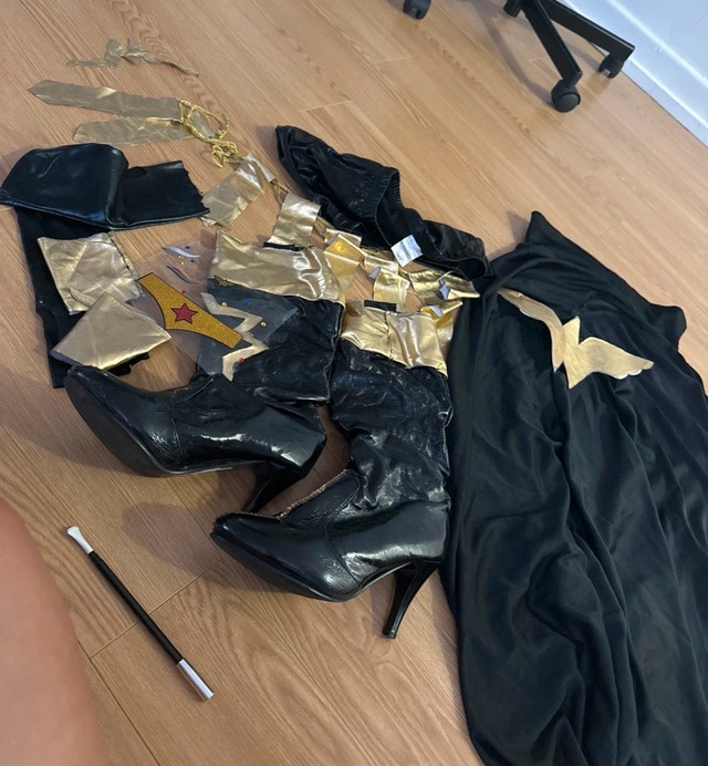 114I am selling a used costume in good condition. This costume includes a black and gold outfit, a purple dress, and some accessories, all in good condition. If the ad is up, it's available!