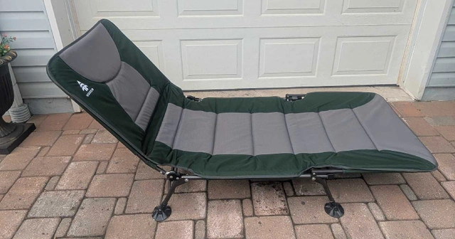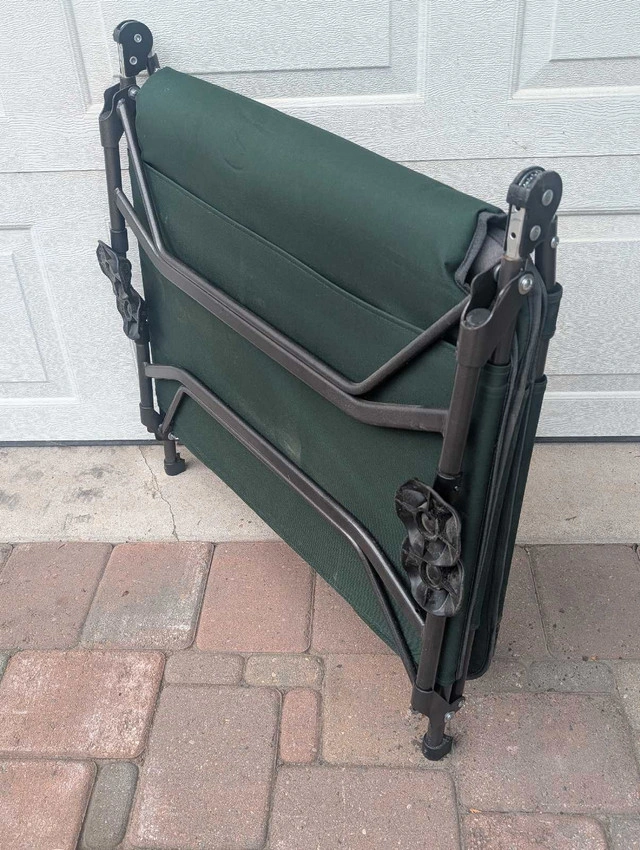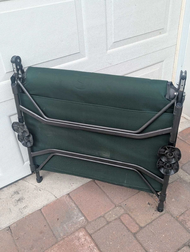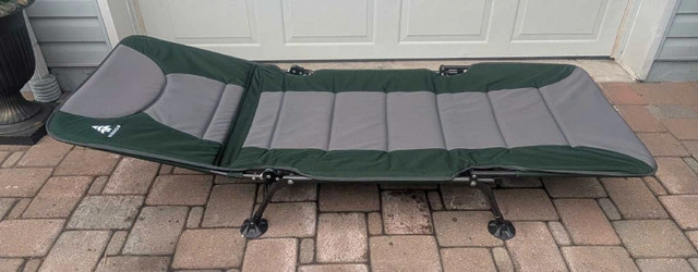 24This cot is designed for the outdoors and is perfect for camping or lounging by the lake. It features a sturdy frame, comfortable padding, and folds for easy storage and transport. This cot has been used on a few camping trips but is still in great shape, ready for new adventures!