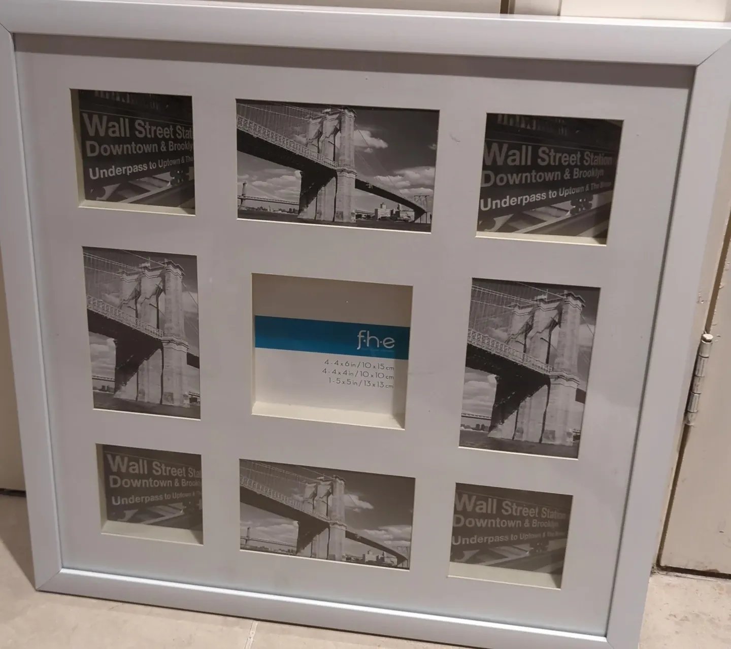 I'm selling a white collage picture frame by FHE! It's designed to hold nine photos of various sizes: four 4x6 inch photos, four 4x4 inch photos, and one 5x5 inch photo. Perfect for displaying your favourite memories!