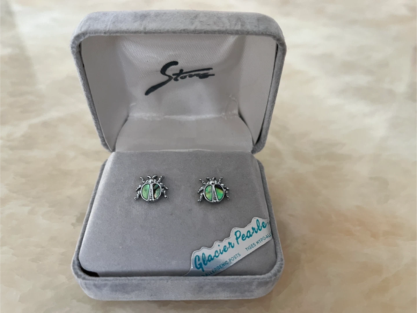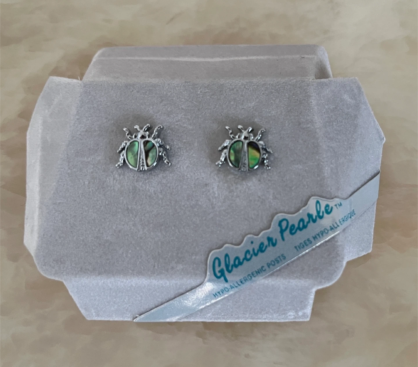 New Glacier Pearle ladybug earrings with a sterling silver finish, complete with their original box.