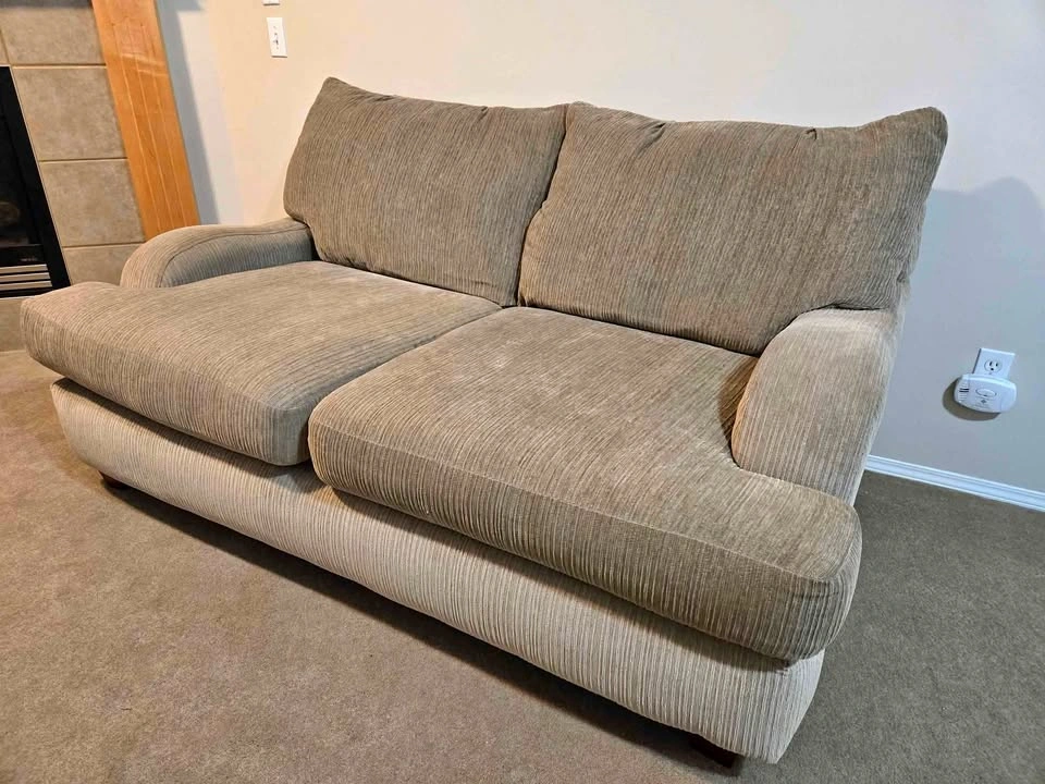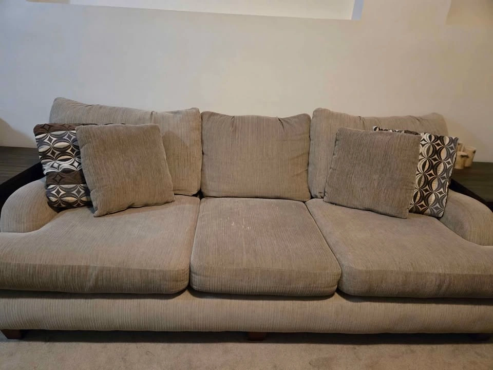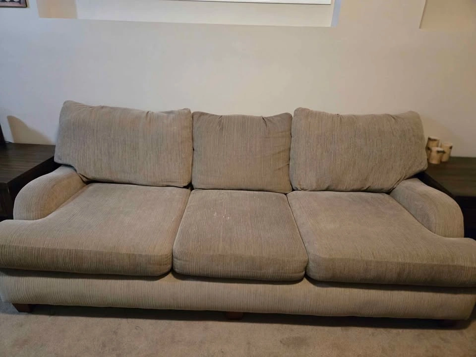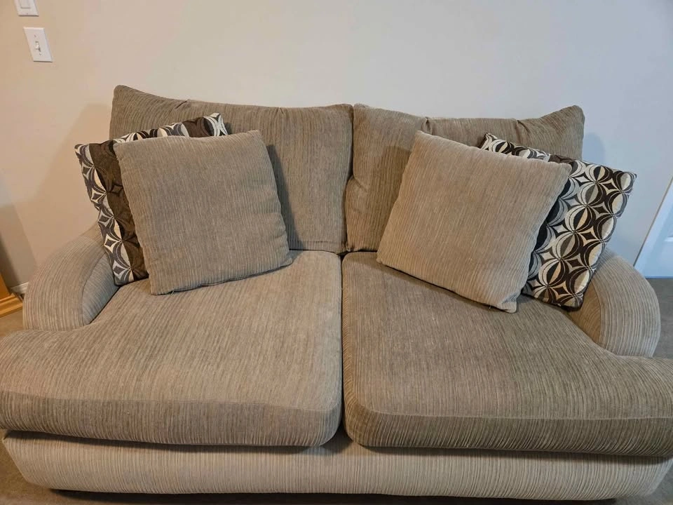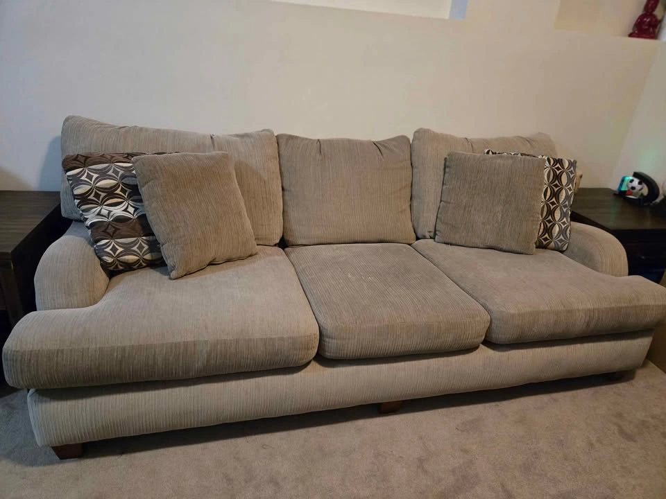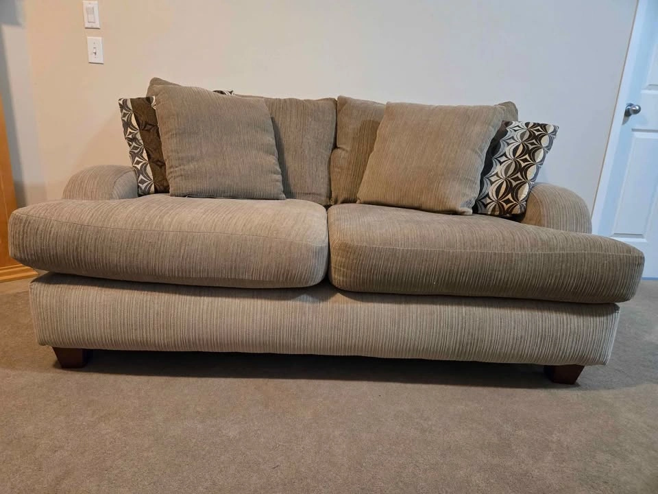 10Very large and comfy couch with love seat and throw pillows. Some wear on middle cushion of couch. Does not effect use or cause any discomfort. Originally from The Brick. Couch- L 95" x W 42" x H 36". Love seat- L69" x W 42" x H 36". Pick up Copperfield SE- willing to help loading into your vehicle.