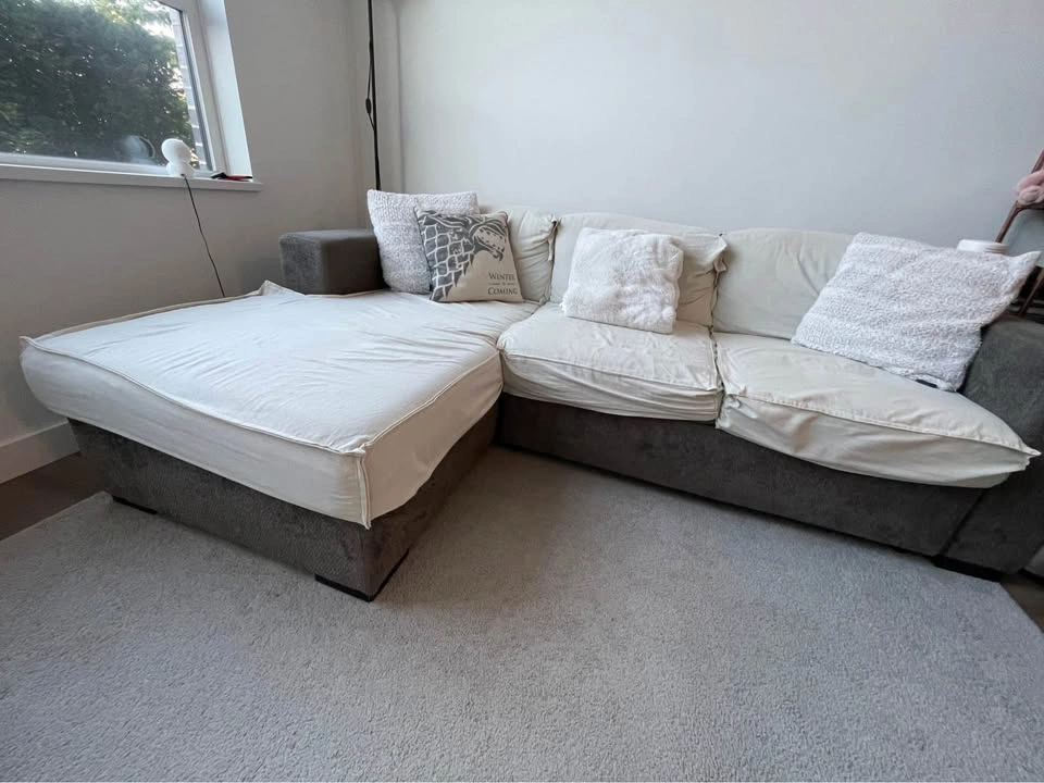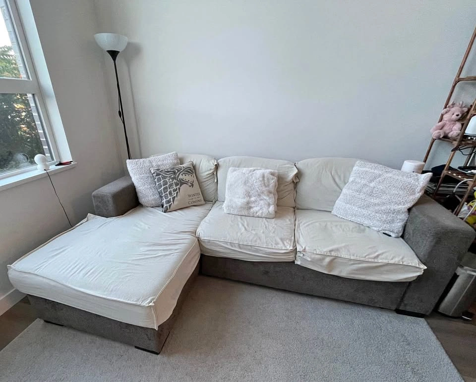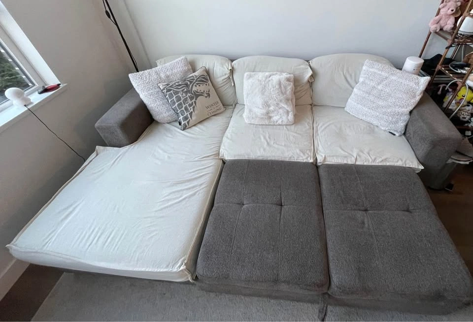 10Original price was 1K. Disclaimer: The first owner had a dog that teared into one of the cushion. We repaired it as we could and made covers for the entire couch. The sofa bed has only be used a few times. This couch still has plenty of life in it. Selling because we are moving. Comes with handmade covers for all seating cushions and back cushions. Washable (handmade so not perfect but works very well) We are moving and we need it gone. Pick only (Burquitlam), no delivery.