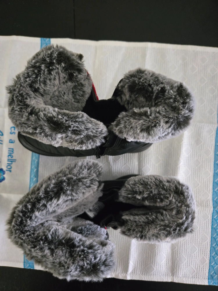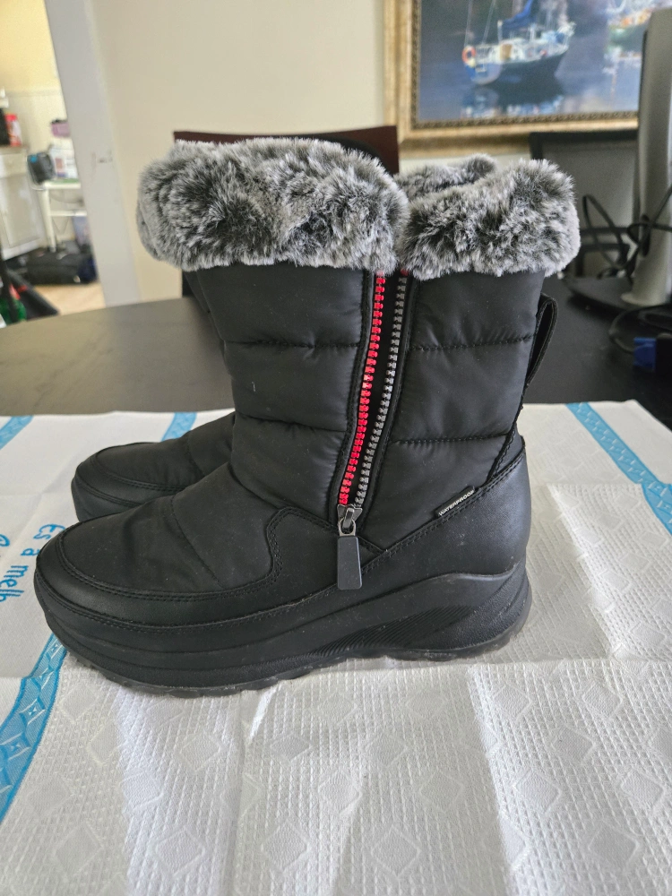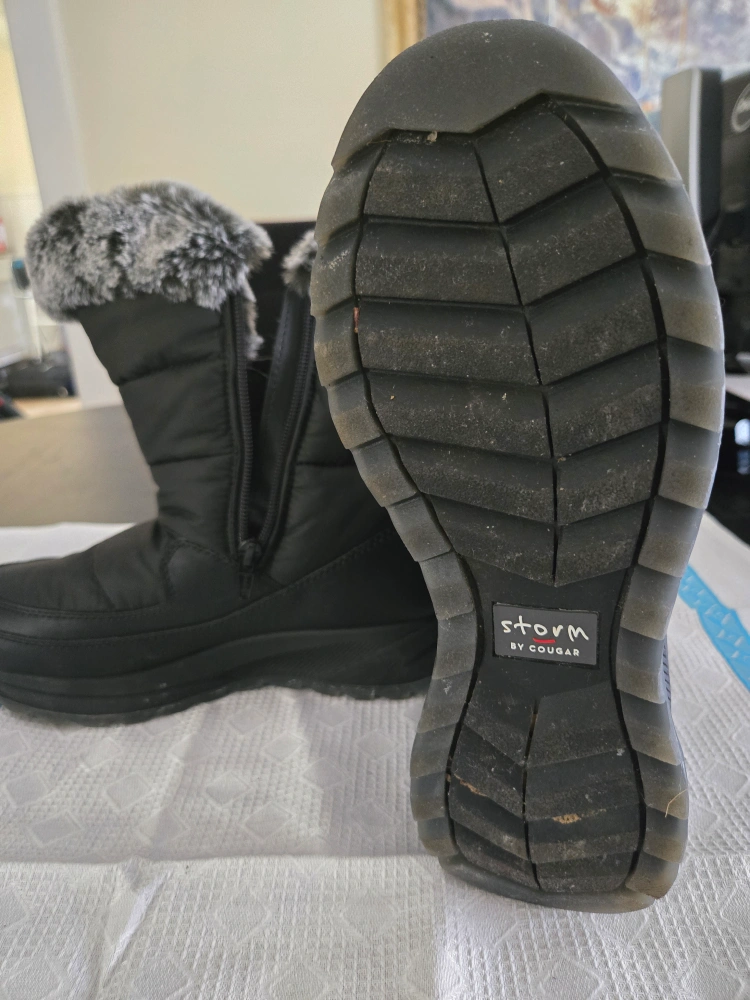 These are a pair of Cougar Storm winter boots in black. They have a faux fur trim and a waterproof design. Perfect for keeping your feet warm and dry this winter!